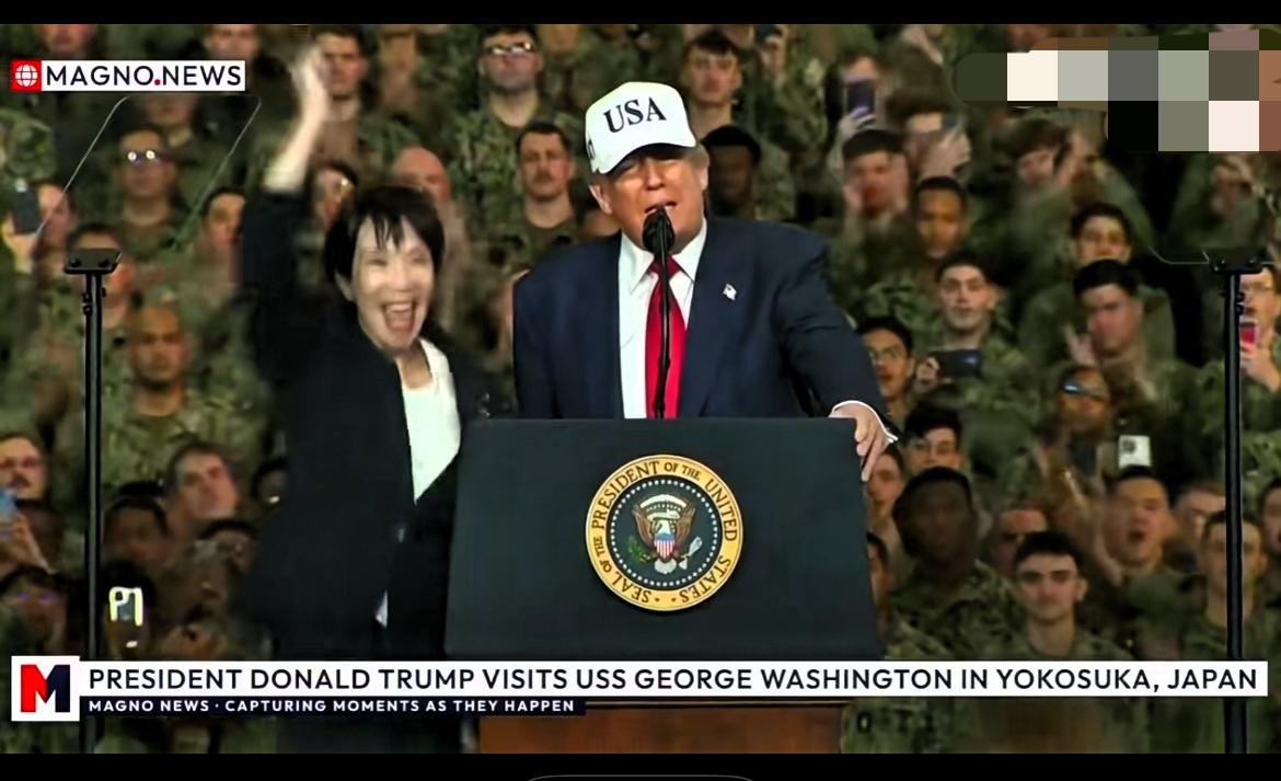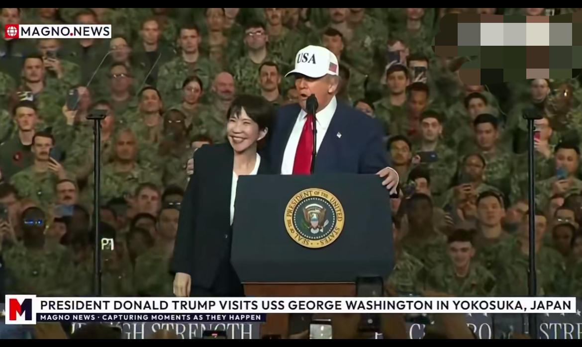 日本为特朗普的到来而欣喜若狂! 当地时间10月27日,特朗普抵达东京,开启了他的访日之旅。日本首相高市早苗在社交平台发文表示欢迎,还提及东京的地标建筑全都点亮了。当晚,特朗普前往皇宫与天皇进行了会晤。28日,他与高市早苗举行了会谈,议题涵盖经贸以及日本增加防卫费等方面。 他们还一同乘坐空军一号直升机前往驻日美军横须贺基地,并登上了“乔治·华盛顿”号航母。高市早苗激动得原地打转转,随后被特朗普揽入怀中。那场景,不知情的人还以为他们有多亲密呢! 不过,高市早苗刚刚就职,政府的支持基础并不稳固,她和特朗普之间想必也存在分歧。特朗普逼日救美,买大豆不够,5500亿投资也得给,这让日本首相身陷两难。不知道日美这股热乎劲儿究竟能持续多久,实在难以预料。