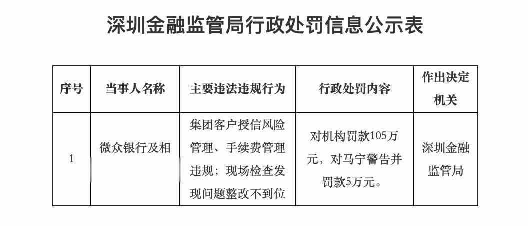 处罚信息显示,微众银行的主要违法违规事实包括:集团客户授信风险管理、手续费管理违规;现场检查发现问题整改不到位。