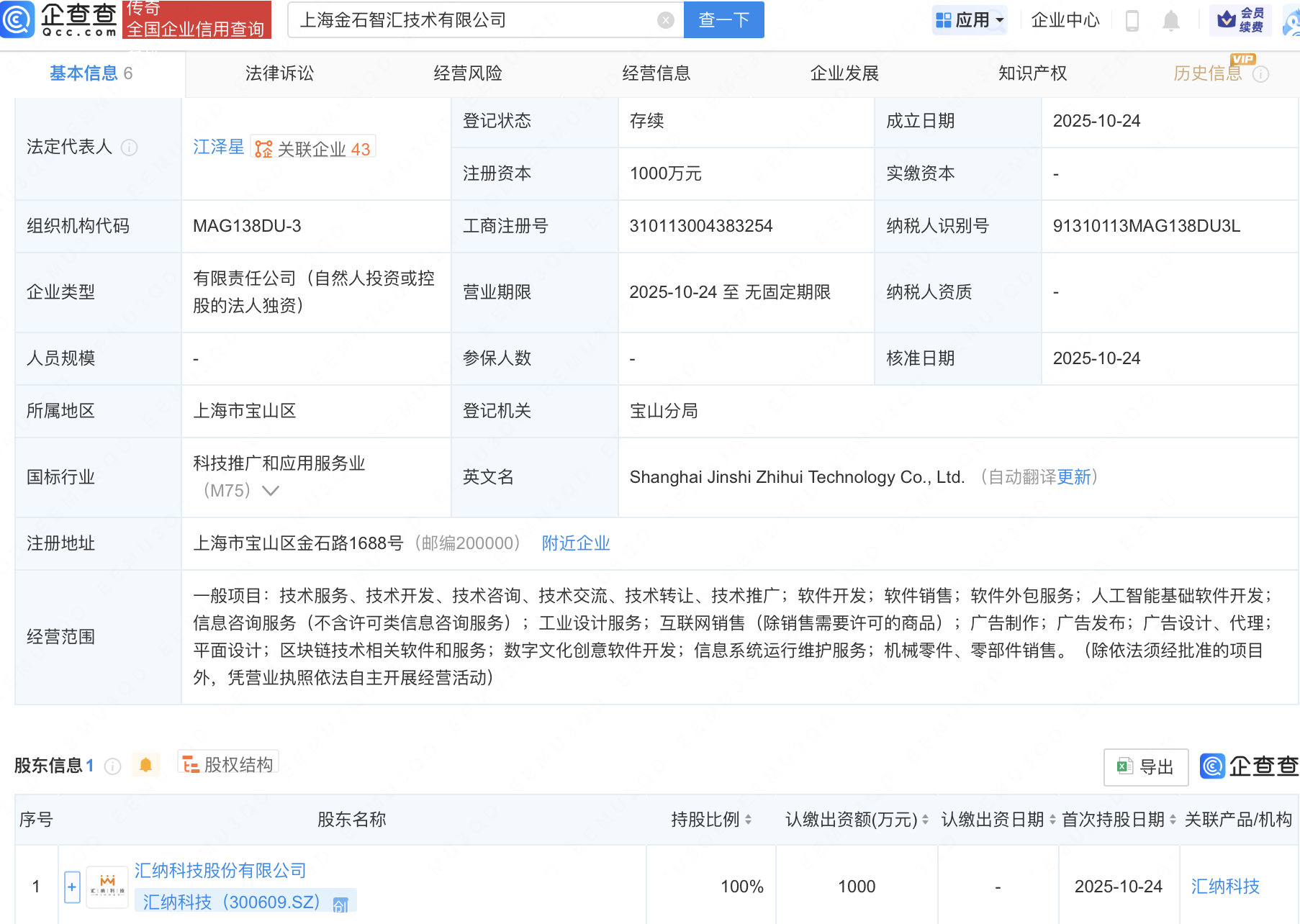企查查APP显示,近日,上海金石智汇技术有限公司成立,注册资本1000万元,经营范围包含:人工智能基础软件开发;区块链技术相关软件和服务;数字文化创意软件开发等。企查查股权穿透显示,该公司由汇纳科技(300609)全资持股。