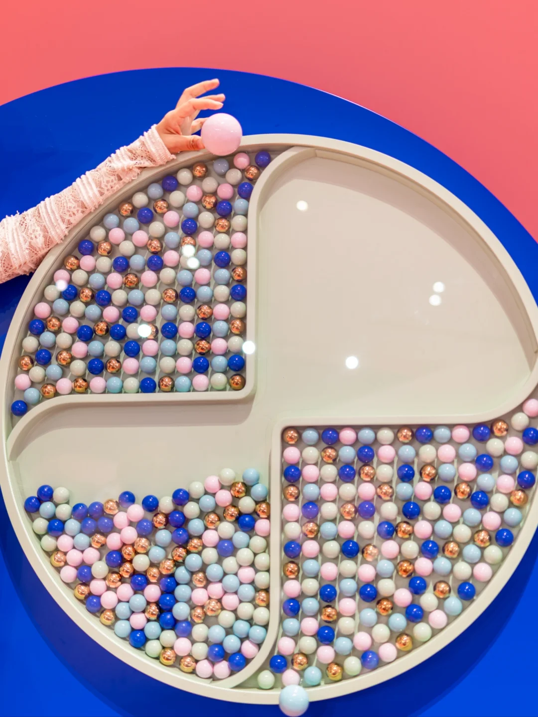 展览空间是和法国艺术家Arthur Hoffner联手打造,梦幻又可爱,现场装置充满奇思妙想,金珠元素灵动,色彩明亮活泼,充满夏日多巴胺氛围!