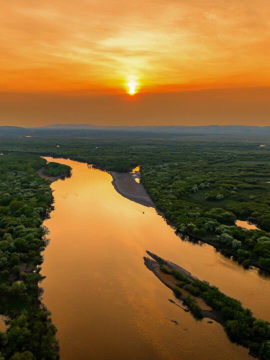 晚霞从四面八方涌来,染透河流草浪翻涌,