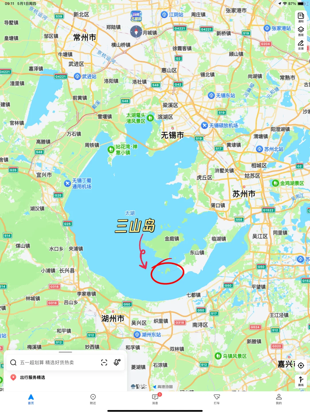 1️⃣ 自驾或打车到东山长圻码头或西山石公山码头,停车25元/天,乘船登岛