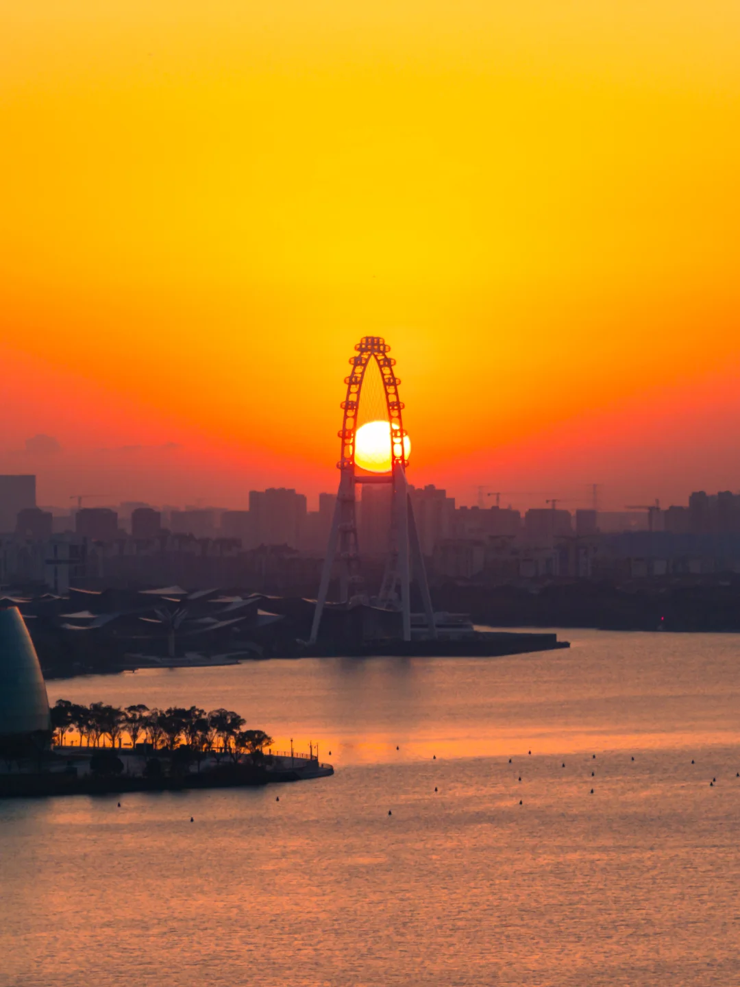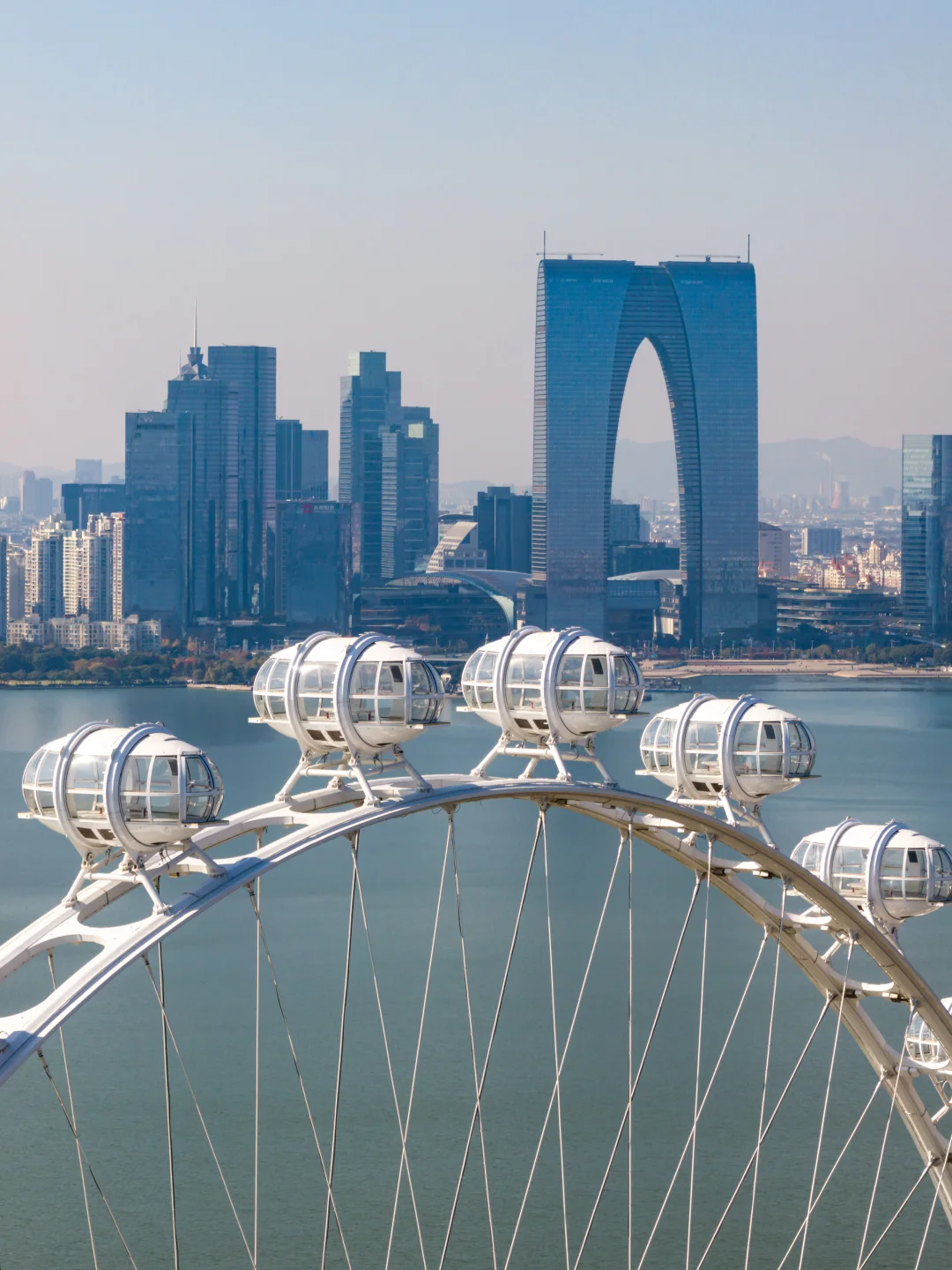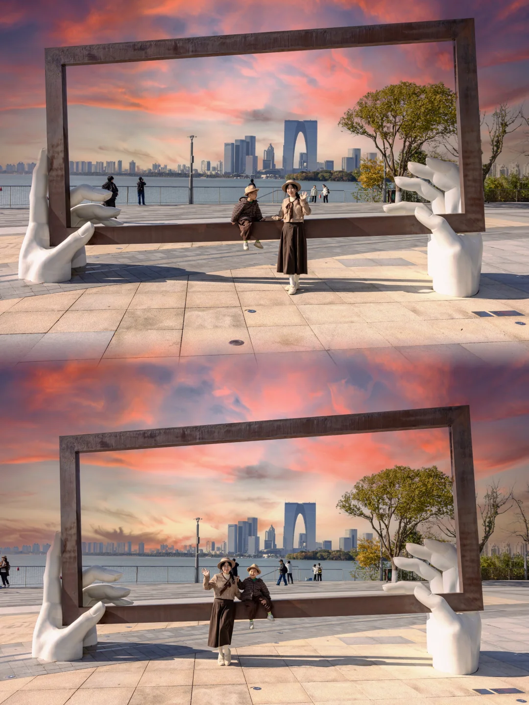 感受苏州的闲适的一面,日出时金鸡湖湖面泛金,东方之门迎着朝霞亮起