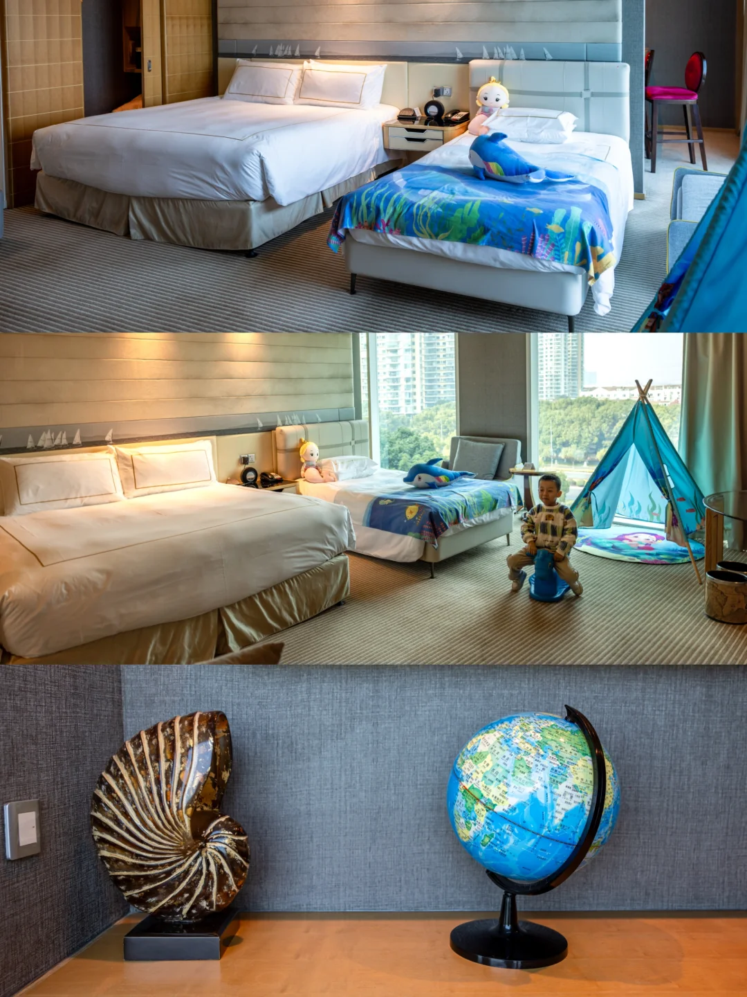 它位于金鸡湖畔,紧邻东方之门,外形像一艘豪华巨轮,客房细节融入航海元素,房间里有地球仪、定制航海图咖啡杯,没有哪个孩子能拒绝这样的酒店,像奇妙探险。