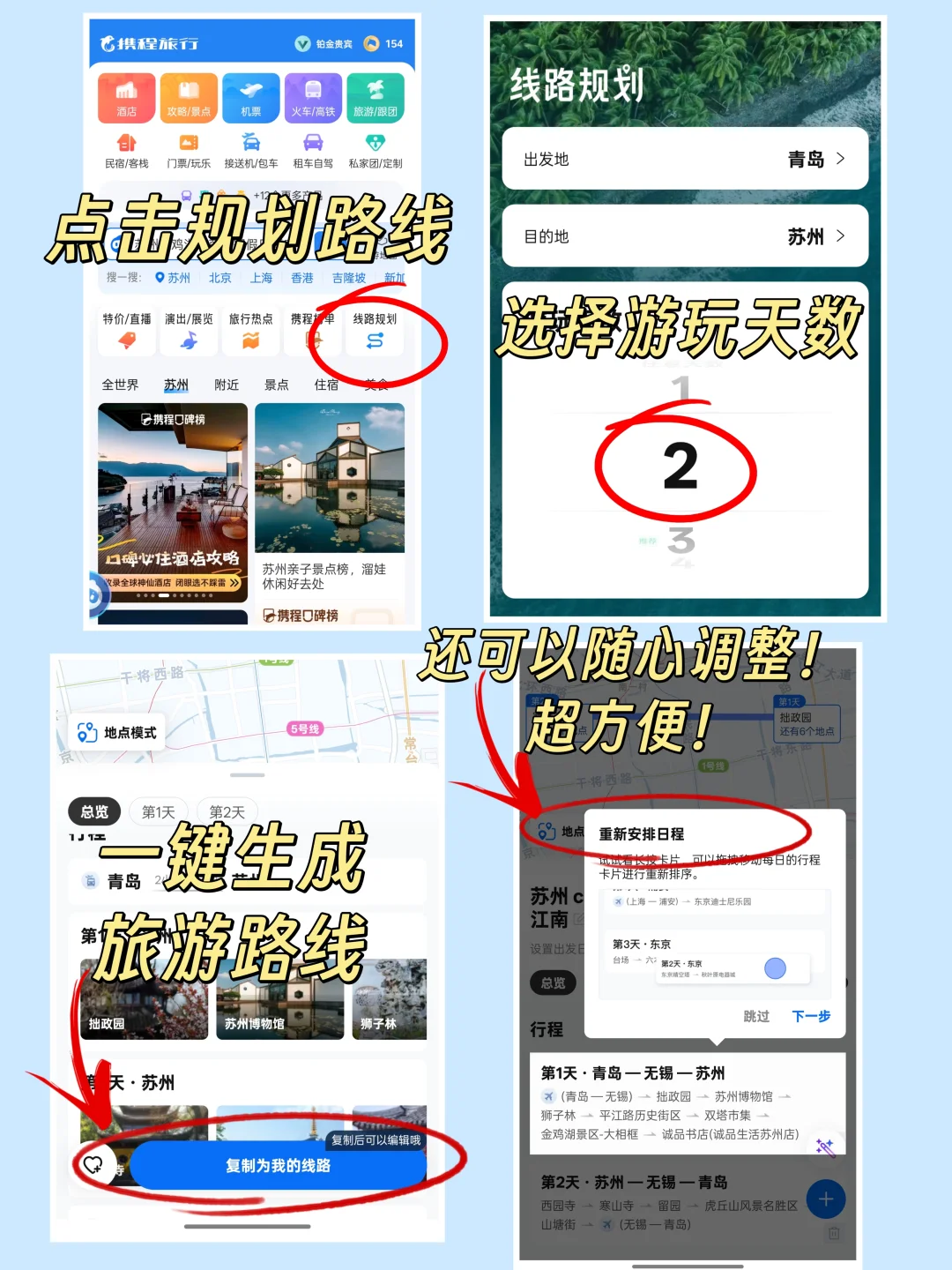 📱打开携程APP,点击“路线规划”,选择出发地和目的地,输入旅行天数,点击智能推荐(路线生成后也可自己手动修改行程),一条完美的旅行攻略就OK了,而且推荐线路中包含了大部分口碑榜上必打卡的当地景点,不绕路,非常高效,特别是第一次去某个目的地没有概念的时候,这个路线功能能帮你一网打尽所有值得去的景点。
