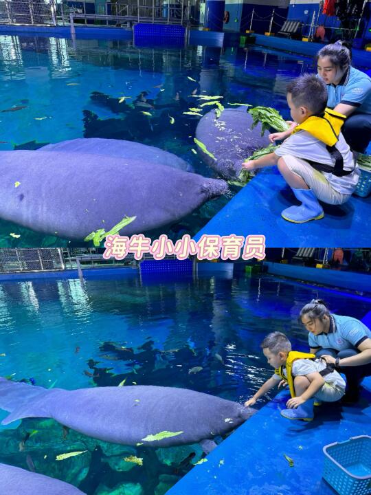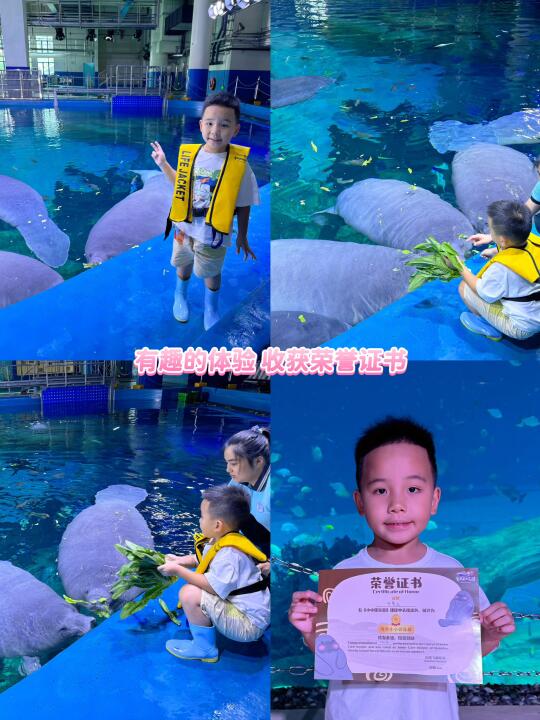 深度体验党必冲“海牛小小保育员”,零距离看温顺的“水中巨人”🦭最棒的是动手环节:yeye亲手挑选新鲜蔬菜🥬将食物轻轻递给海牛。看它慢悠悠吃掉蔬菜,yeye脸上满是骄傲和温柔!这亲手付出的责任感和爱的连接,比说一百遍爱护动物都有力👍yeye还变身丰容设计师,把油麦菜固定成“树”🌳看着海牛玩耍啃食菜树,yeye成就感爆棚😍毕业证书在手,荣耀加身