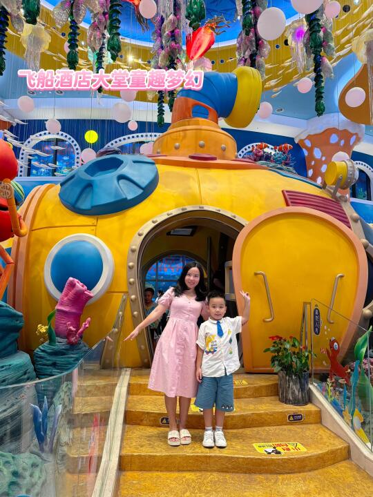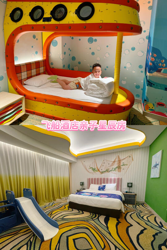 晚上入住飞船酒店亲子星辰房,体验再升级🌟推门仿佛踏入太空舱,天花板繁星闪烁,专属儿童床、滑梯,细节贴心🛝最棒是超便捷,楼下就是飞船乐园,玩累了分分钟“回舱”躺平