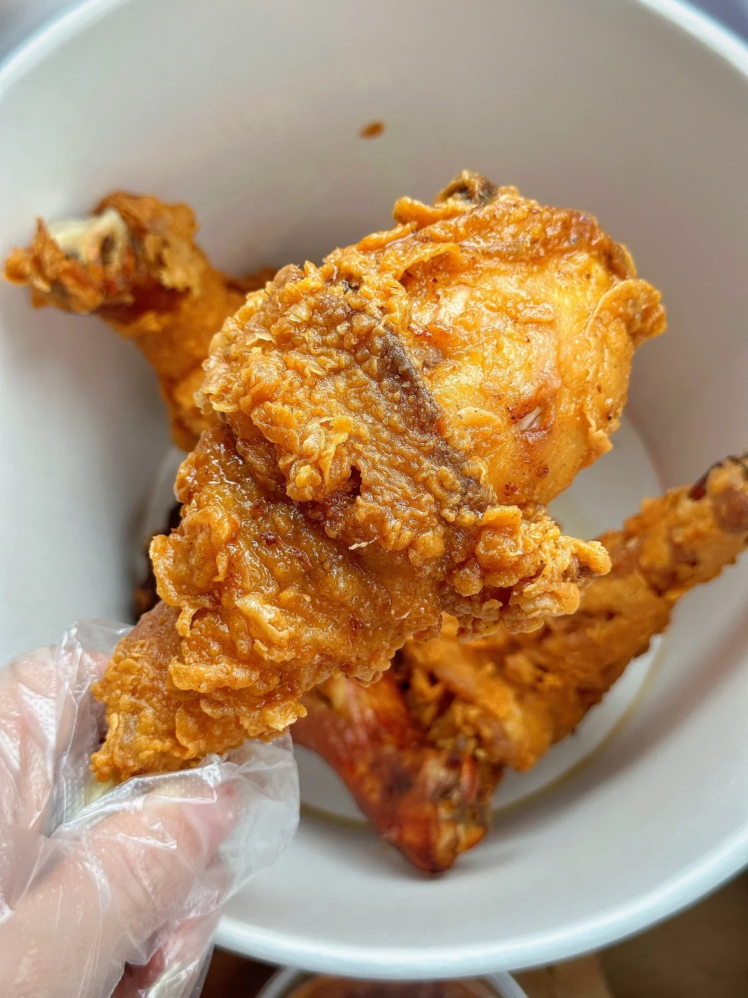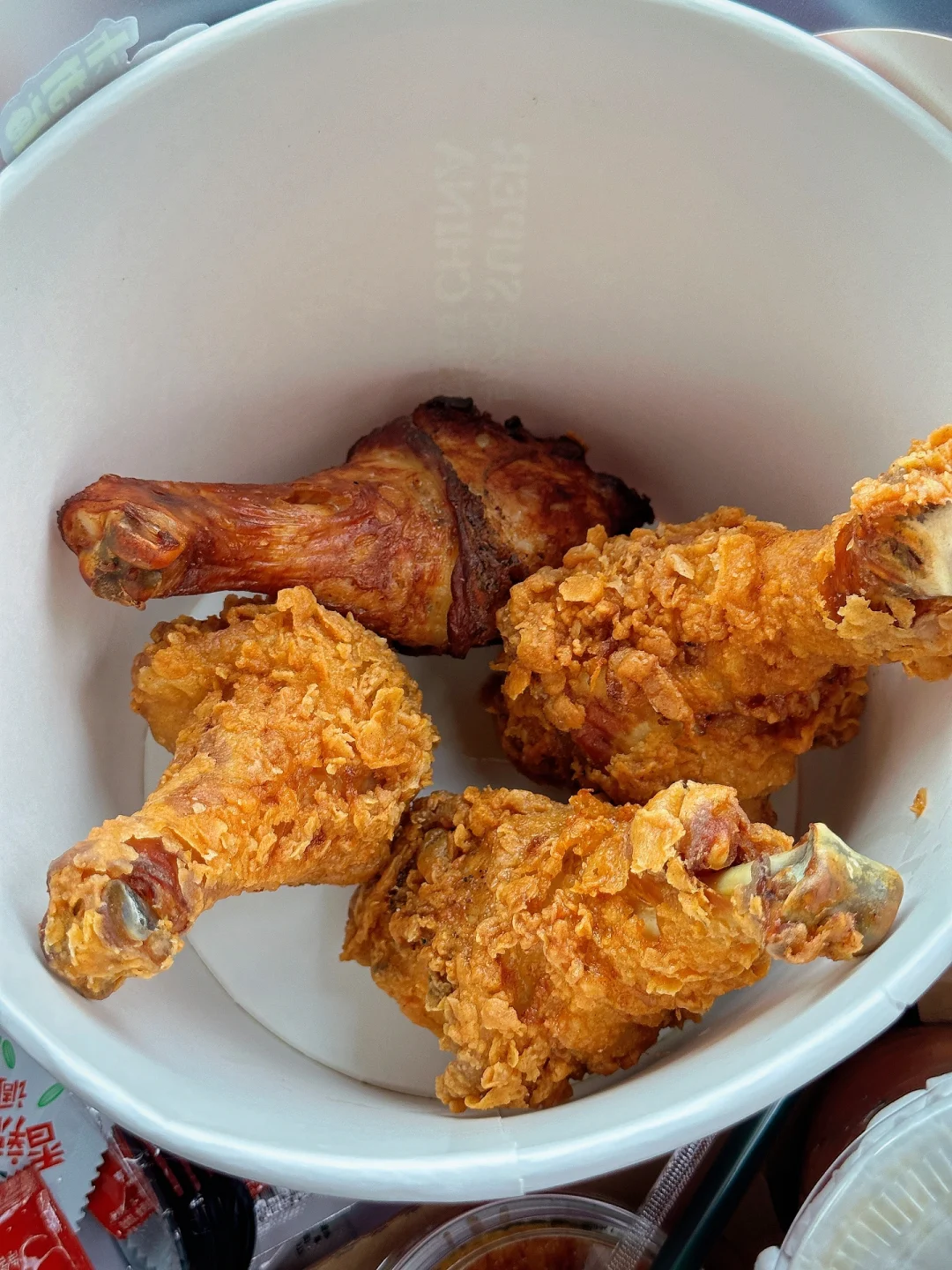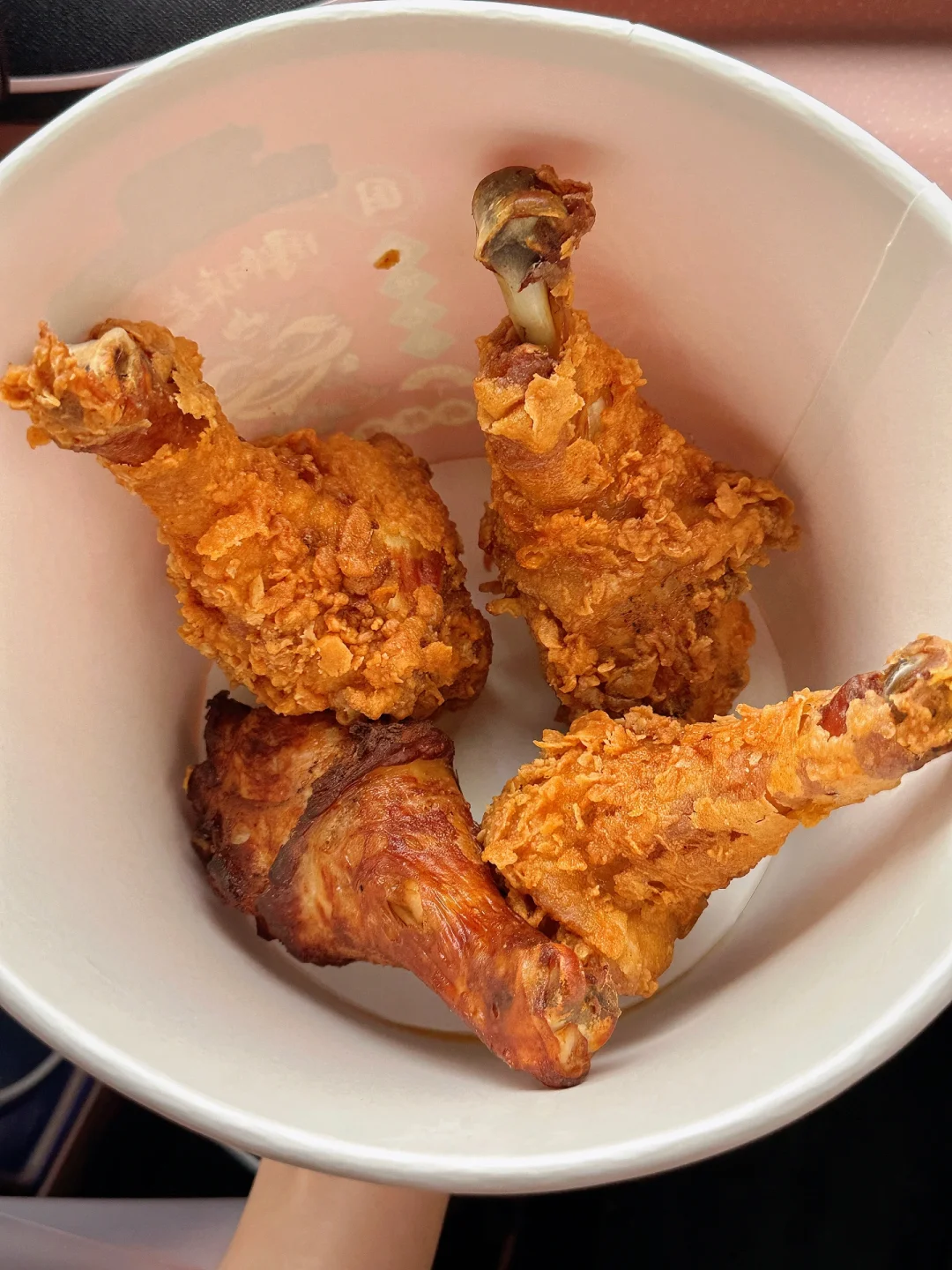 纯炸的鸡腿不油腻,而且入味,鲜嫩多汁,鸡腿是放了黑胡椒碎腌制的,能够吃得出食材的新鲜,和家里新鲜白切鸡一样口感~