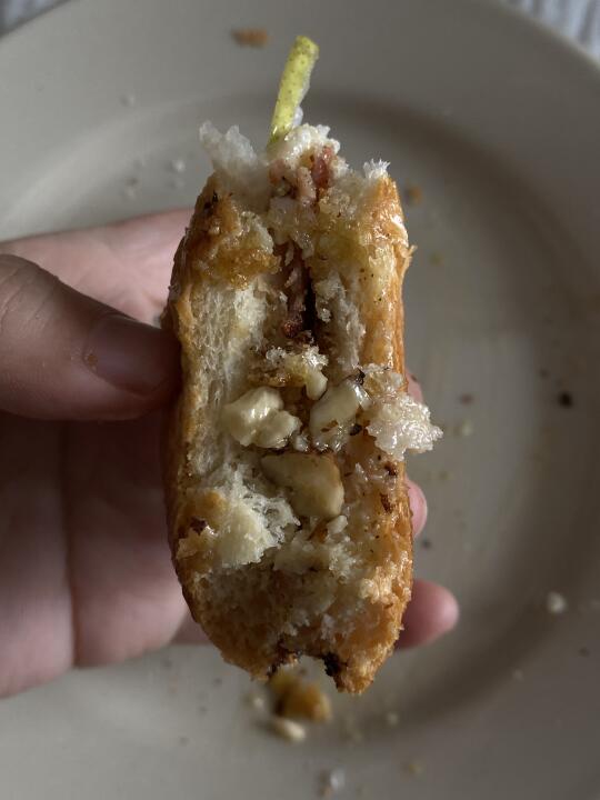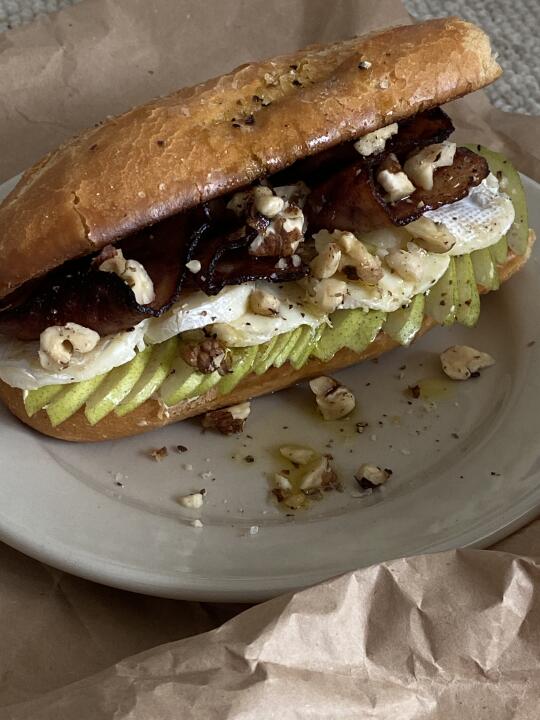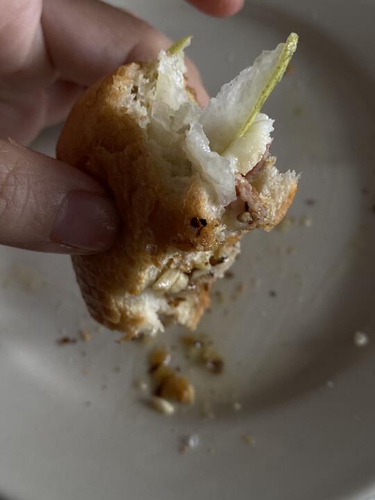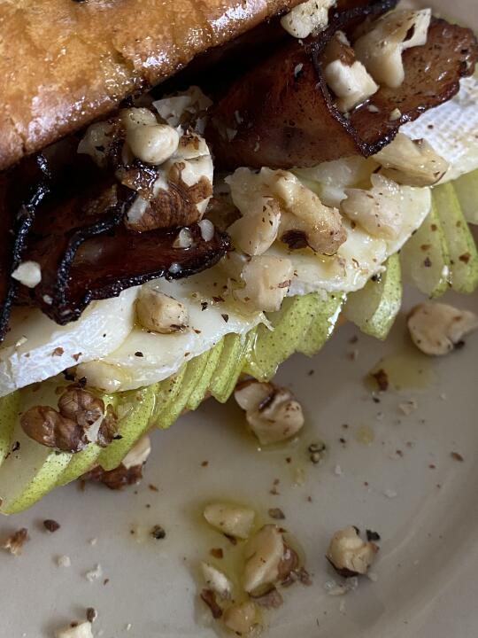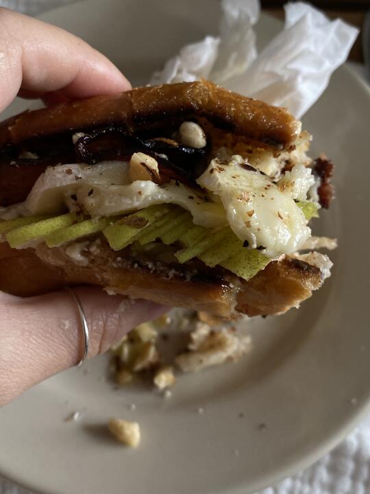梨子的清甜 切薄的脆口感 搭配油油的蒜香培根 吃到嘴里鲜甜咸香!中间混合布里黏黏口感的奶味 醉了~ 油香油香的 梨子来做三明治 打开新世界大门啊啊 抱大腿求你们去做 食材简单好做 懒人食谱了!!推荐!