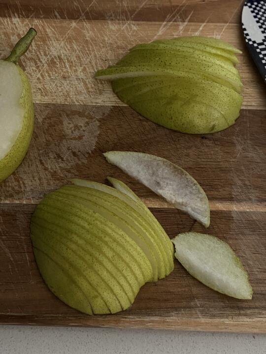❶一层梨片 拧一点海盐胡椒 (有黑醋就滴2滴 没有不影响)