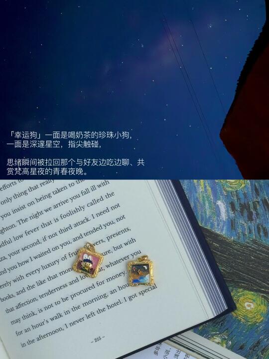 「幸运狗」一面是喝奶茶的珍珠小狗,一面是深邃星空,指尖触碰,思绪瞬间被拉回那个与好友边吃边聊、共赏梵高星夜的青春夜晚。