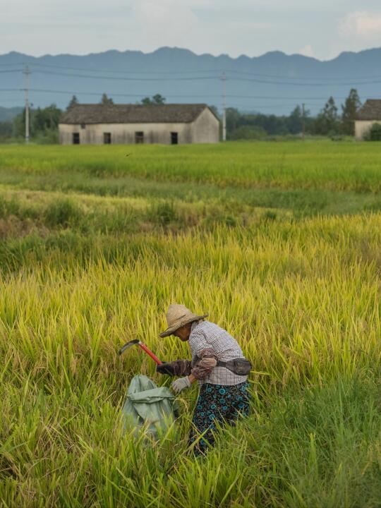 丰收的稻田里劳作村民,仿佛一副油画。