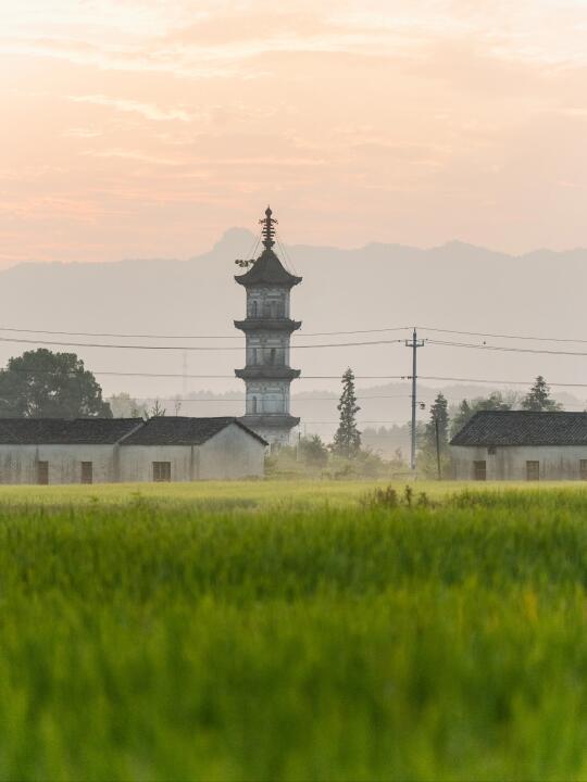 清晨,伫立在村口的云龙塔在晨雾中若隐若现。