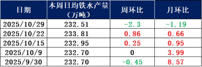 2025年10月29日,据兰格调研,全国201家生产企业铁水日均产量为232.51万吨,较上周减少2.3万吨,总体月环比减少1.19万吨;25年8月日均铁水产量为230.88万吨,9月日均铁水产量为230.14万吨,10月日均铁水产量为232.74万吨。