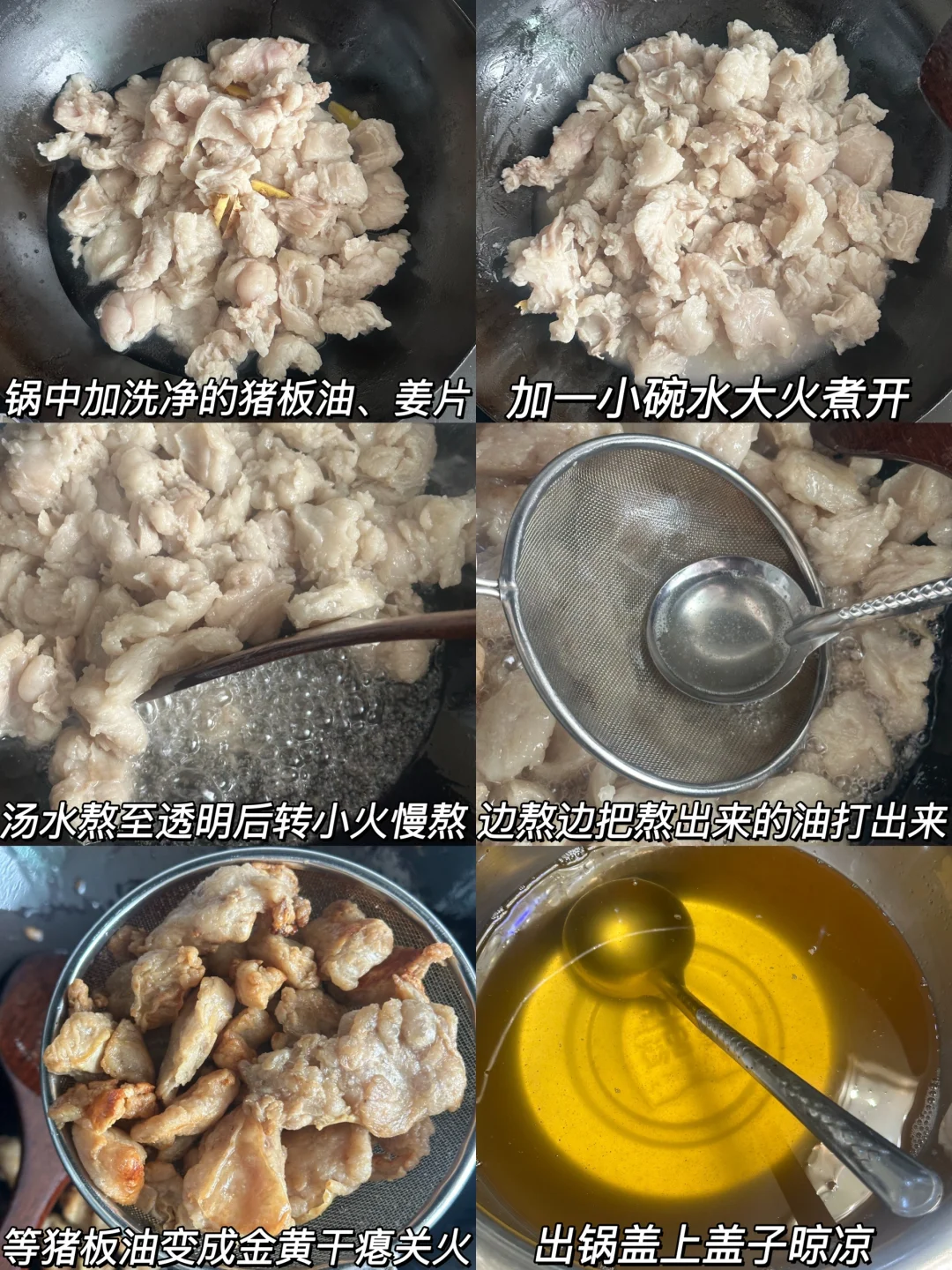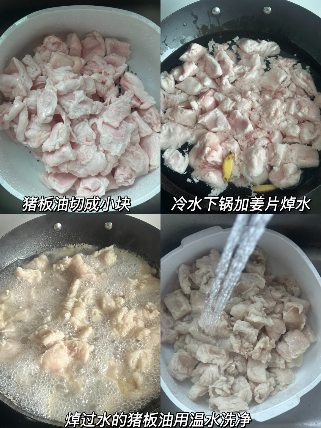 雪白雪白的猪油原来这么简单!!熬出来的猪油拌饭拌面啥的可比金龙鱼油、玉米油啥的可香多啦,厨房小白也可以轻松熬出来~🥰 🌟准备食材🌟 猪板油2-3斤 🌟做法🌟 1️⃣猪板油切成小块,冷水下锅加姜片焯水 2️⃣焯过水的猪板油用温水洗净 3️⃣锅中加洗净的猪板油,姜片,加一小碗水大火煮开,汤水熬至透明后转小火慢熬,边熬边把熬出来的油打出来 4️⃣等猪板油变成金黄干瘪就熬完啦,出锅盖盖晾凉即可