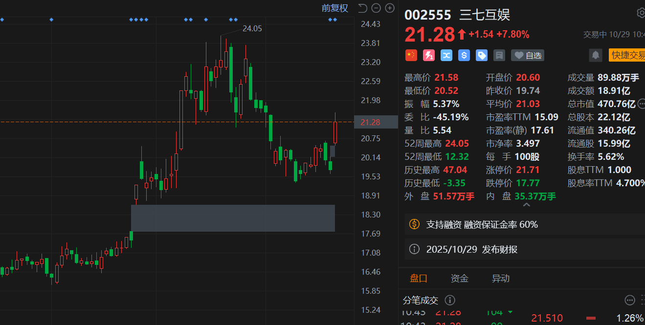 受多重利好消息影响,三七互娱(002555.SZ)大幅上涨逼近涨停,现报21.28元,总市值470亿元。
