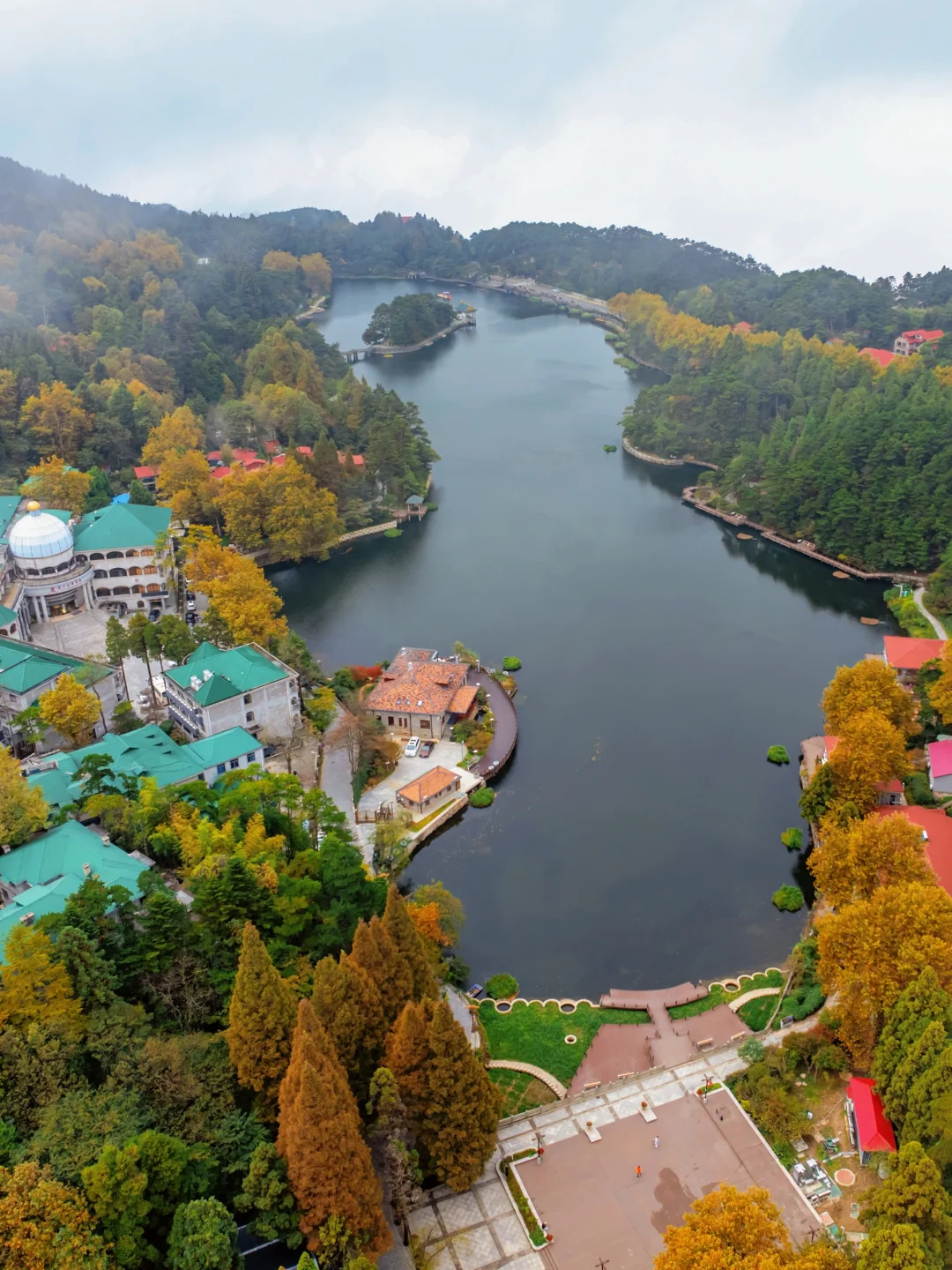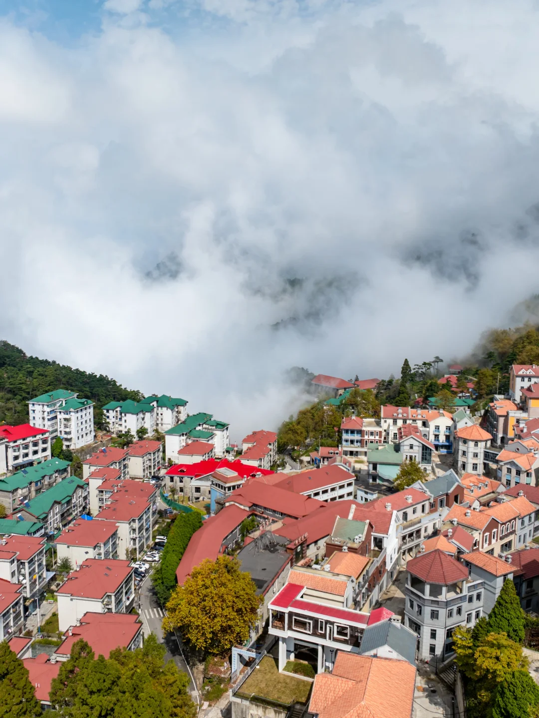 这个秋天我终于来到了庐山。不过眼前的庐山和我想象的不大一样。经历1h盘山路后,我们竟来到了一座现代化的城市!山中云雾缭绕,红绿屋顶别墅错落有致,像在欧洲一样。