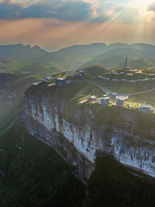 一路盘山路上山,傍晚丁达尔光照射在山顶像仙境,山顶凉爽无比,白色崖壁很震撼
