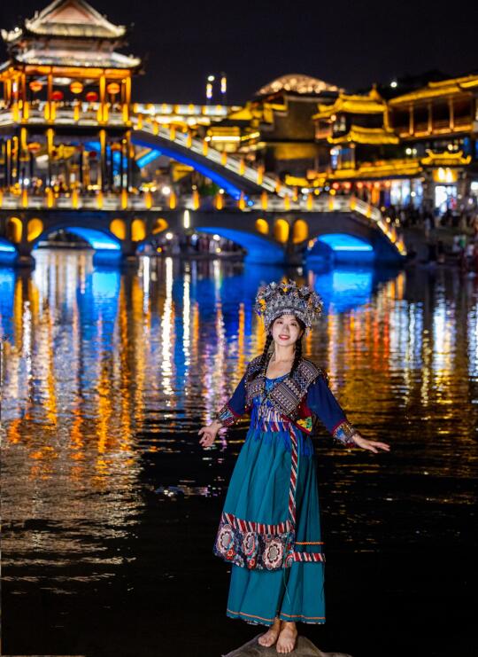 沱江穿城而过,沿两岸游览,古建筑倒影在水中,穿着民族服饰的女孩成为风景,七点古城亮灯夜景超美,像千与千寻的动漫世界。