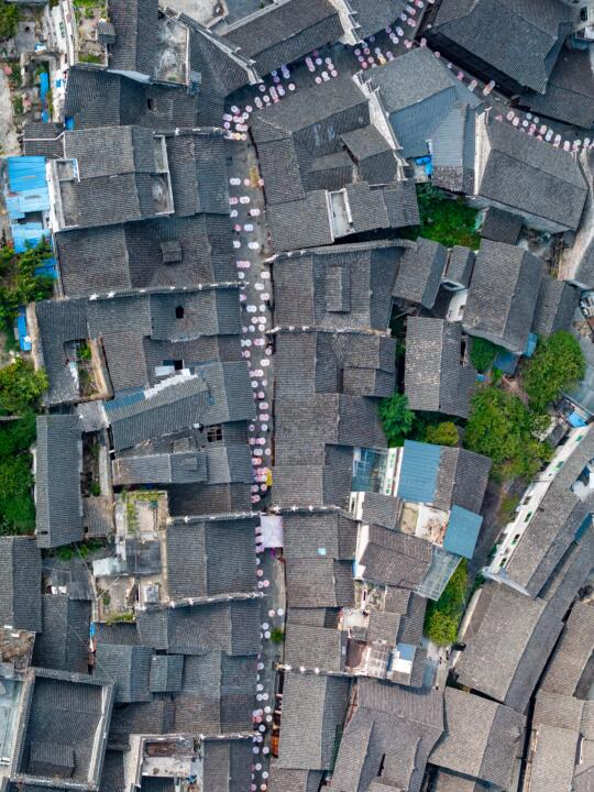 历史可上溯到战国和秦汉,现古街成形于清代初期,安静质朴,屋檐层层叠叠,花伞下阳光斑驳