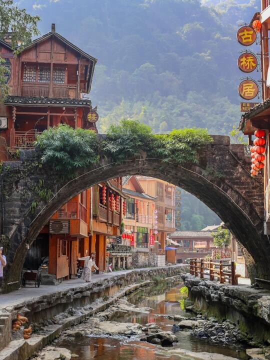 沈从文在《边城》中写到名为“茶峒”的小山城,古镇位于三省川湘黔交界处,食物好吃,综合了湖南四川贵州的风味,依然保持着原生态的生活,安静缓慢,非常治愈。