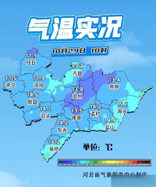今日10时,沧州全区气温多在12~16℃上下,吴桥最高,肃宁和任丘并列最低;和昨天同时刻相比,大部分县市气温都上升了2~5℃左右,献县升幅最大(↑5.4℃)。