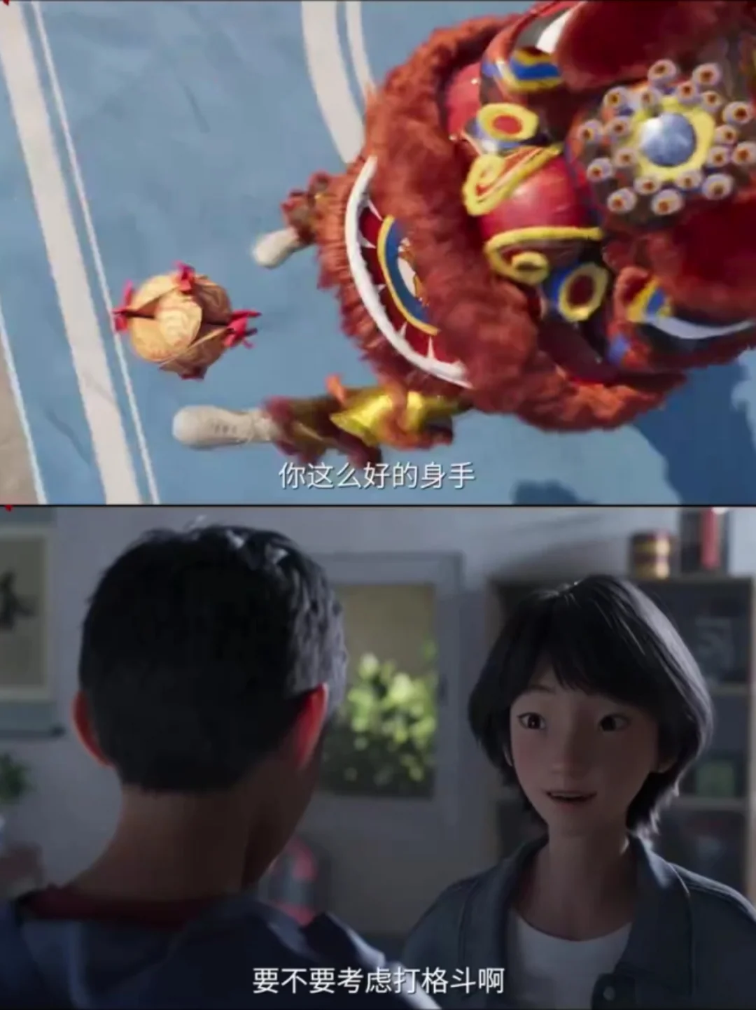 预告虽然展现了传统武术,但看完正片,舞狮占比完全OK,而且从舞狮到武术结合过渡得让人眼前一亮,特别喜欢电影里对中华武术的呈现。画面的真实感也更强了,看的时候我有几次还恍惚了,这到底是动画还是真人电影?