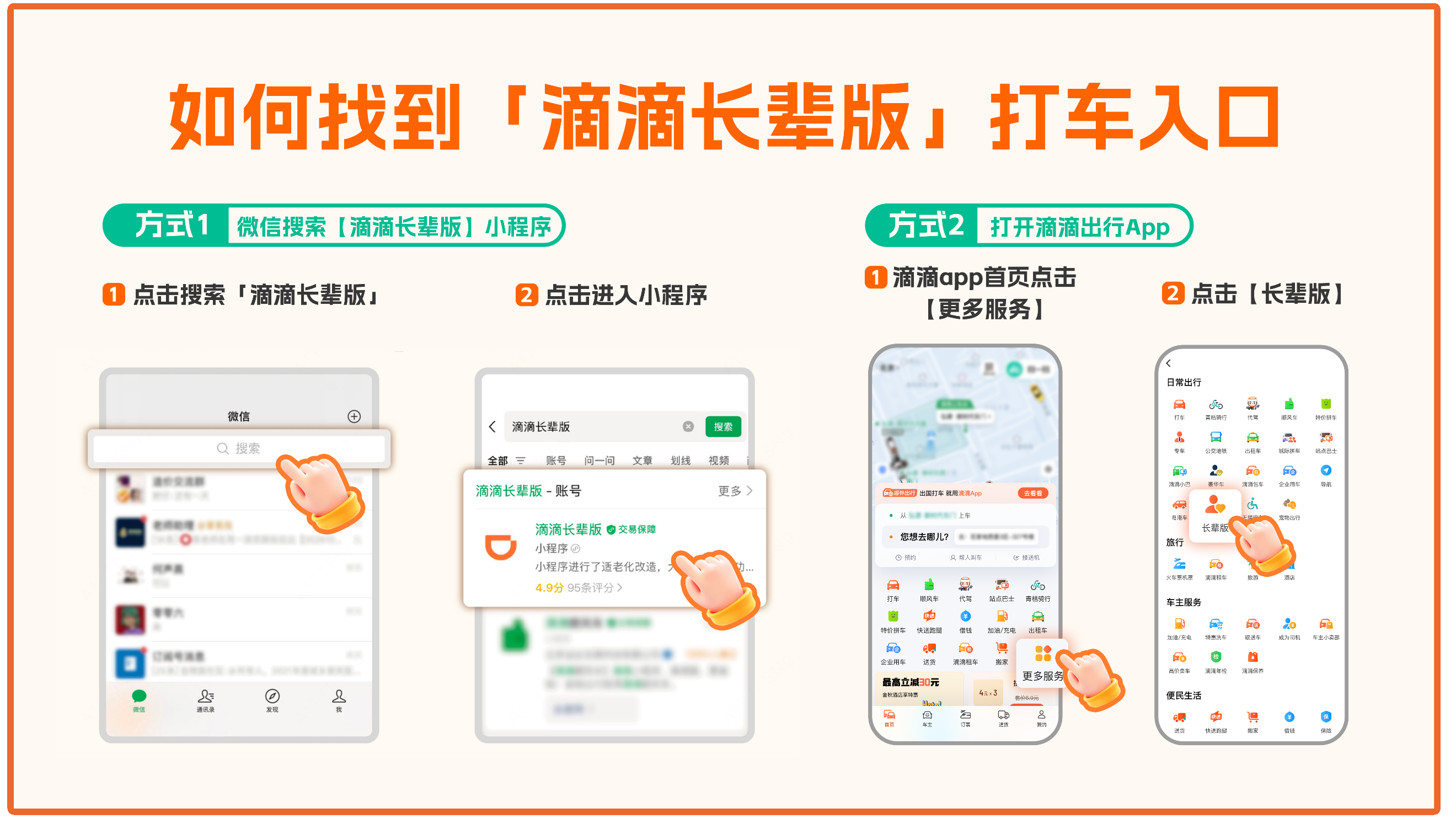 目前,滴滴助老打车服务已覆盖全国355座城市,为老年用户提供了便捷的出行选择。为更加了解老年用户在打车过程中遇到的难题,近年来,滴滴助老打车团队对5000多名老人进行了深度访谈。围绕老年用户不会线上叫车、找不到车、不会支付三大痛点,滴滴不断进行功能改造升级,除了优化界面设计、简化操作流程外,还通过增加端外服务,从社区门口的助老打车标识牌,到医院场景下的优先派单;从一键叫车的简洁操作,到电话热线的贴心服务,滴滴用实际行动编织助老出行的服务脉络,努力为方便3.1亿老年人的出行“多迈一小步”。