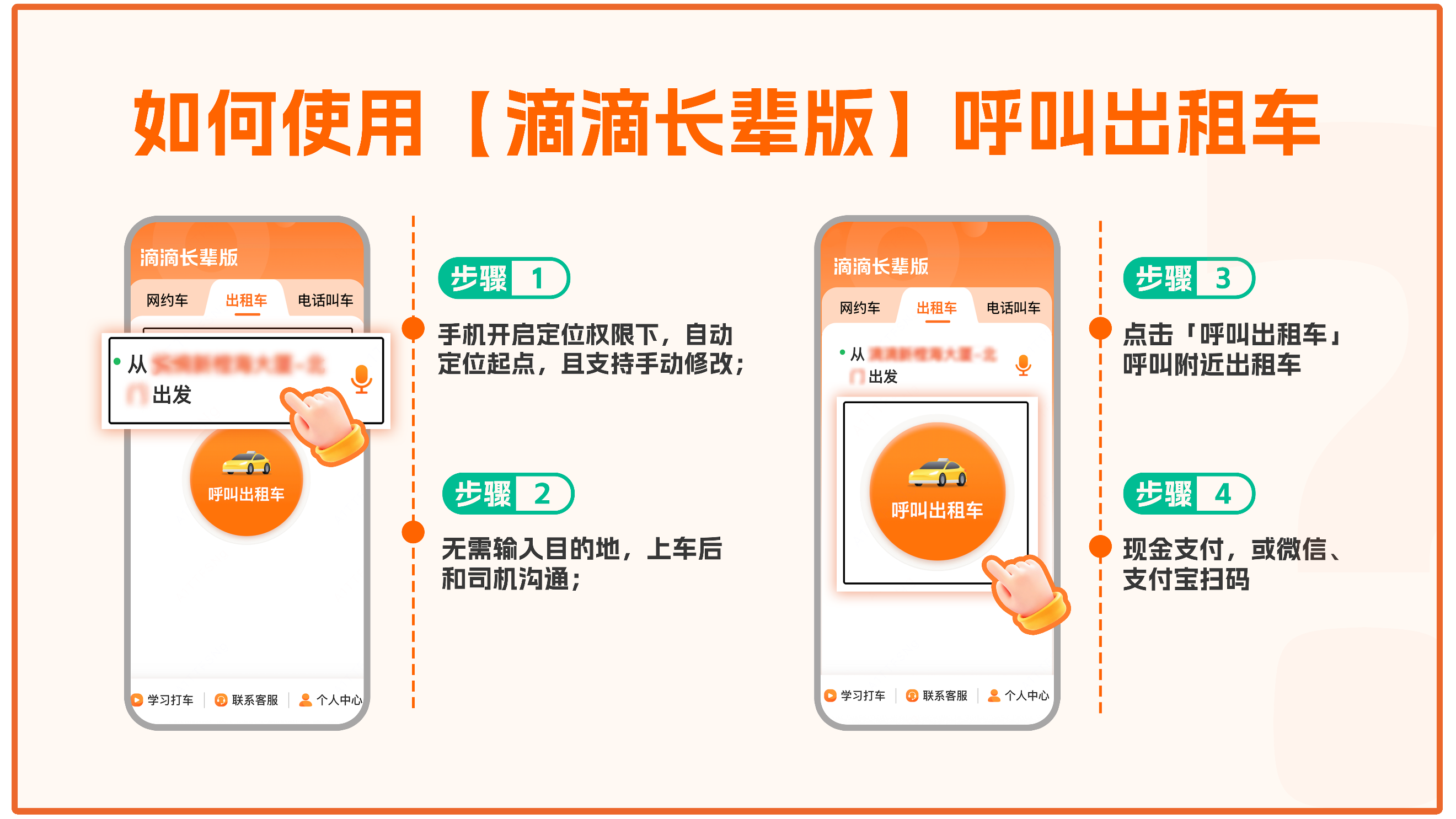 操作流程大幅简化,提供“一键叫车”功能,老年用户呼叫出租车时,无需输入目的地即可发单;考虑到支付习惯,产品保留了出租车的线下现金支付方式,只为让长辈们的出行少一分踌躇,多一分从容。