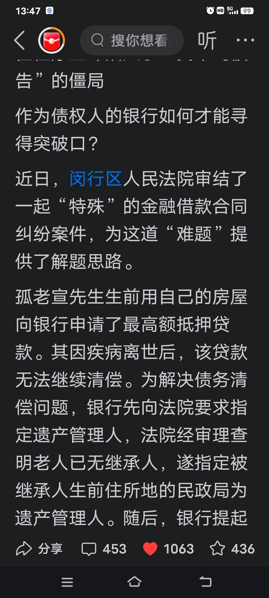 上海这桩案子饶有趣味。孤老宣先生生前以房屋作抵押,向银行贷款66万,却因急病离世。他既没留下遗嘱,也没有继承人,这让银行追债陷入了“找不到被告”的困境。 银行先向法院请求指定遗产管理人,上海闵行区人民法院对这起“特殊”案例进行了审核,这着实是个有难度的问题,只能将宣老生前住所地指向民政局。随后,银行提起诉讼,要求民政局在管理遗产的范围内清偿贷款。民政局则称自己没有偿还义务,仅配合拍卖房子,用拍卖所得款项偿还本息。若遗产不足以偿还,超出部分无需偿还,诉讼费不足部分也无需承担。 最终,法院认定贷款合同合法有效,银行已履行放贷义务,宣老未按约定还款。这起案件为类似的金融借款纠纷提供了解决思路,也体现了法律在处理特殊情况时的严谨性。 的确,孤老宣先生没有亲近之人,也无人继承遗产,自然难以找到偿还贷款的人。况且,若他生前拥有大量资产,这些资产可归民政局所有,所以办事理应合情合理。上海老人遗产 上海遗产案 上海房产继承案 上海房屋纠纷案