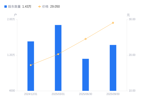 日期A股户数(户)流通A股户均持股数(股)户均持股市值(万元)2025-09-301428328503.5482.802025-06-301118036414.6789.332025-03-311875221710.5443.992024-12-311507827000.6646.442024-09-301627525014.8140.322024-06-301777222882.6432.472024-03-312353417280.1231.882023-12-313132612981.8830.172023-09-301532726532.9337.892023-06-30194262147.243.53