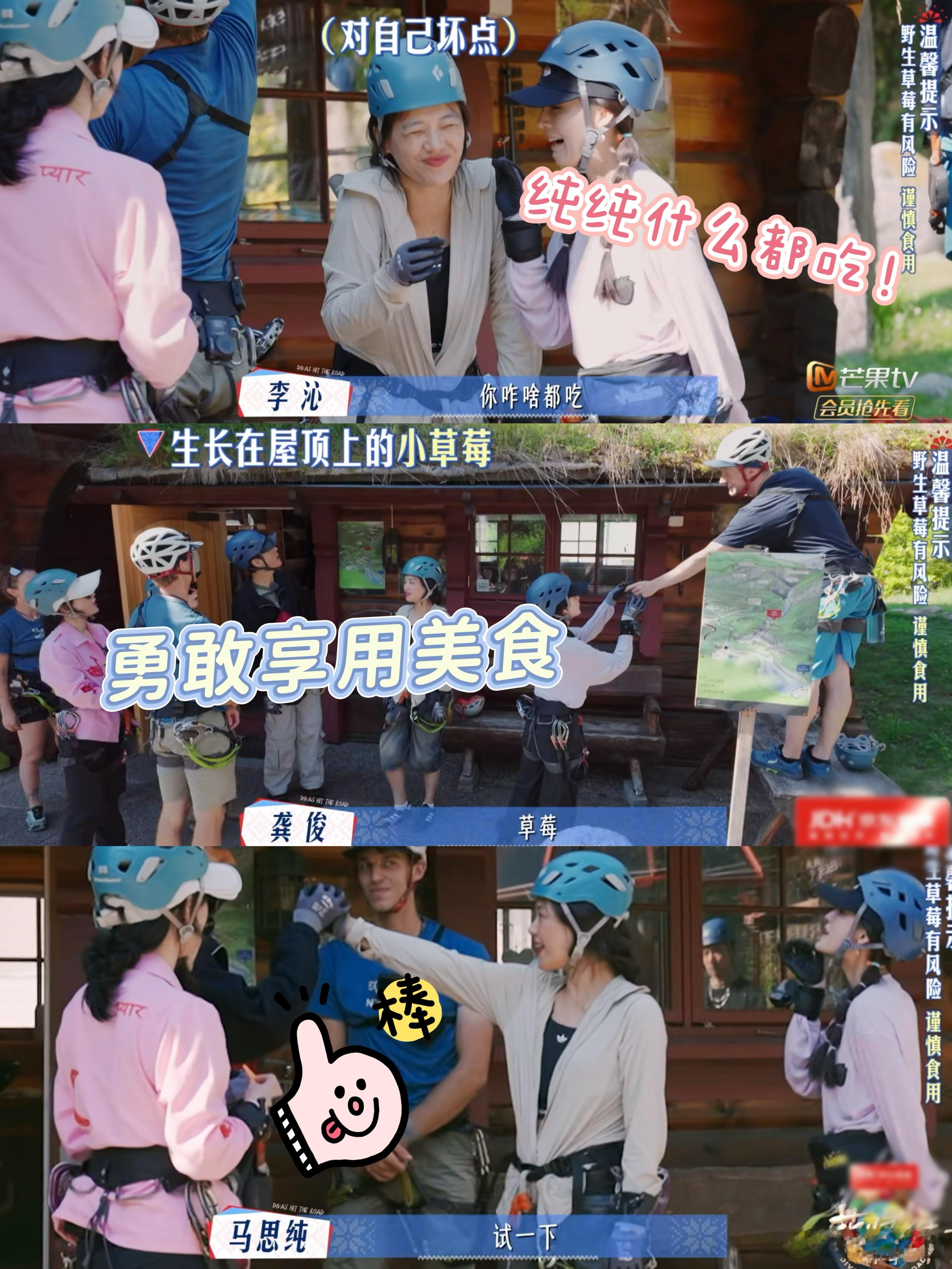 纯纯也是很喜欢尝试!连长在屋顶的小草莓也要尝一下,连李沁都忍不住发问咋啥都吃。