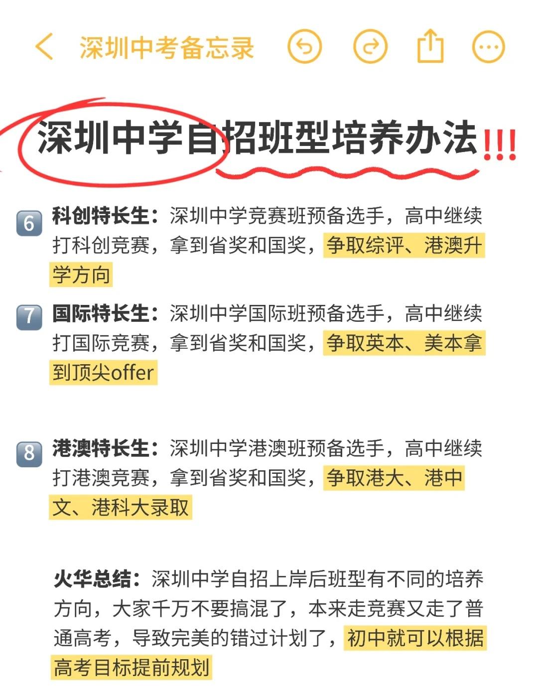 深圳中学自招班型培养办法! 1、数学特长生:深圳中学竞赛班预备选手,高中继续打数学竞赛,拿到省奖和国奖,争取保送清北、强基降分这个方面 2、物理特长生:深圳中学竞赛班预备选手,高中继续打物理竞赛,拿到省奖和国奖,争取保送清北、强基降分这个方面(深中接下来会这方面发力) 3、生物特长生:深圳中学竞赛班预备选手,高中继续打生物竞赛,拿到省奖和国奖,争取保送清北、强基降分这个方面 4、化学特长生:深圳中学竞赛班预备选手,高中继续打化学竞赛,拿到省奖和国奖,争取保送清北、强基降分这个方面 5、编程特长生:深圳中学竞赛班预备选手,高中继续打信奥竞赛,拿到省奖和国奖,争取保送清北、强基降分这个方面 6、科创特长生:深圳中学竞赛班预备选手,高中继续打科创竞赛,拿到省奖和国奖,争取综评、港澳升学方向 7、国际特长生:深圳中学国际班预备选手,高中继续打国际竞赛,拿到省奖和国奖,争取英本、美本拿到顶尖offer 8、港澳特长生:深圳中学港澳班预备选手,高中继续打港澳竞赛,拿到省奖和国奖,争取港大、港中文、港科大录取 火华总结:深圳中学自招上岸后班型有不同的培养方向,大家千万不要搞混了,本来走竞赛又走了普通高考,导致完美的错过计划了,初中就可以根据高考目标提前规划 深圳 深圳中考 深圳中考自主招生