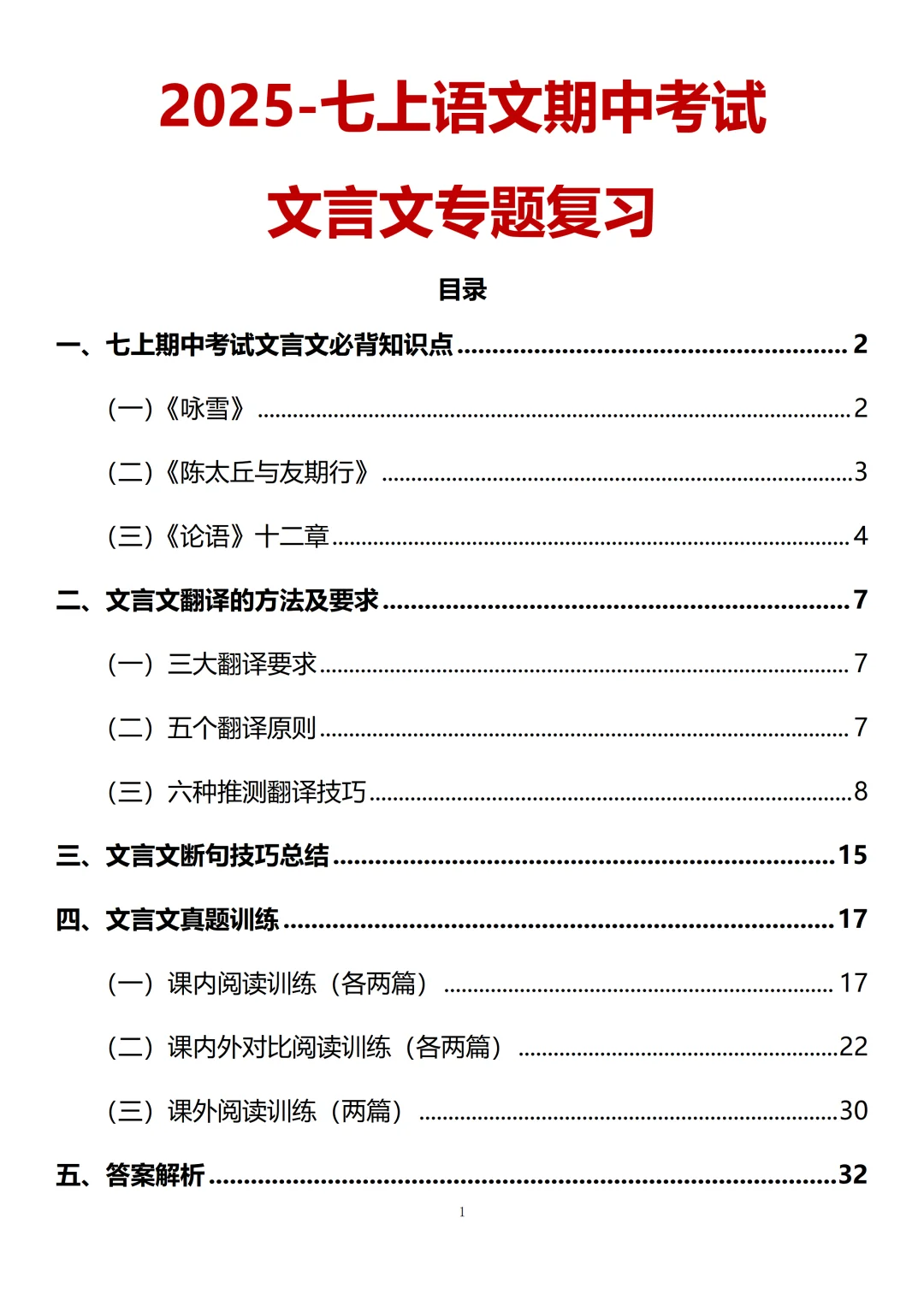 我看了上百张全国各地七上的期中考试试卷。连夜肝出这份「七上期中考试文言文专题汇总」,从文言文翻译、断句、写作手法到主旨情感,4类必考点和14篇文言文阅读真题全覆盖。语文要想得高分,文言文板块必须拿下!