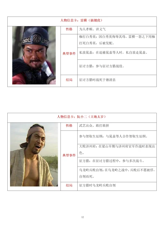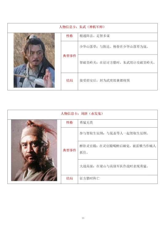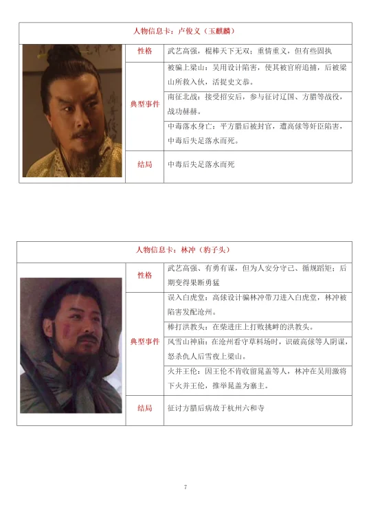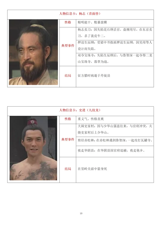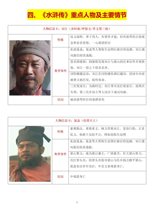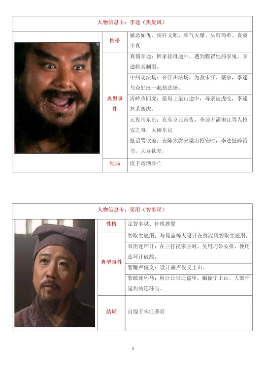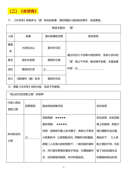 这是期中《水浒传》蕞常考的题型。重点人物包括鲁智深、林冲、杨志、吴用、武松、宋江、李逵等。选择题最常考的形式就是问你哪一情节不属于哪一个人,表格题大多给你情节要你填人物名称/形象,问答题则会要求你结合具体情节概述某一具体的人物形象,分析形象时注意要与情节对应。