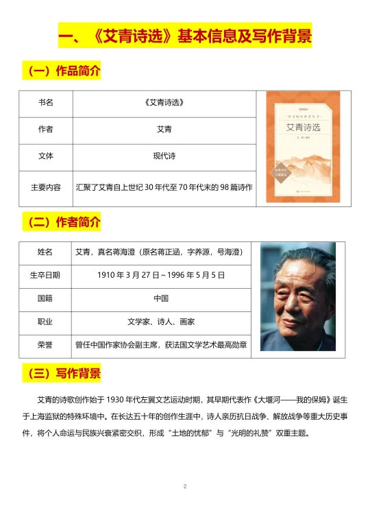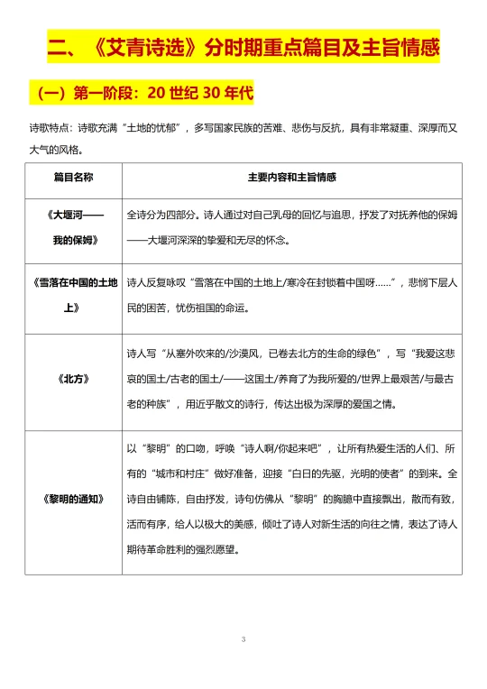 ✅《艾青诗选》分时期重点篇目及主旨情感