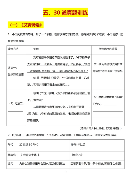 📚20道名著高频真题和答案 为了帮助大家提高期中考试名著板块的分数,老师精选了近 3 年各地期中考试的20道名著真题,包括《艾青诗选》和《水浒传》两本名著的表格题和问答题,提前练好,无论考试考到哪种类型都不用慌。