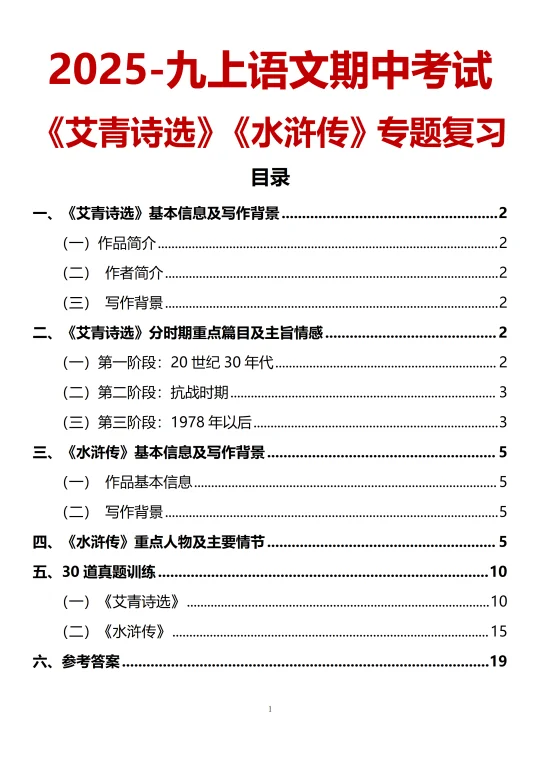 [火R]九上期中考试名著板块主要是考《艾青诗选》和《水浒传》。小蓝老师看了上百套全国各地九上的期中考试试卷。连夜肝出这份「九上期中考试名著专题汇总」。 我帮助大家总结了《艾青诗选》和《水浒传》的基本信息和写作背景,整理了《艾青诗选》分时期重点篇目及主旨情感,《水浒传》的重点人物及主要情节。看完这4类必考点,配合20道真题训练。期中考名著板块稳稳拿下!