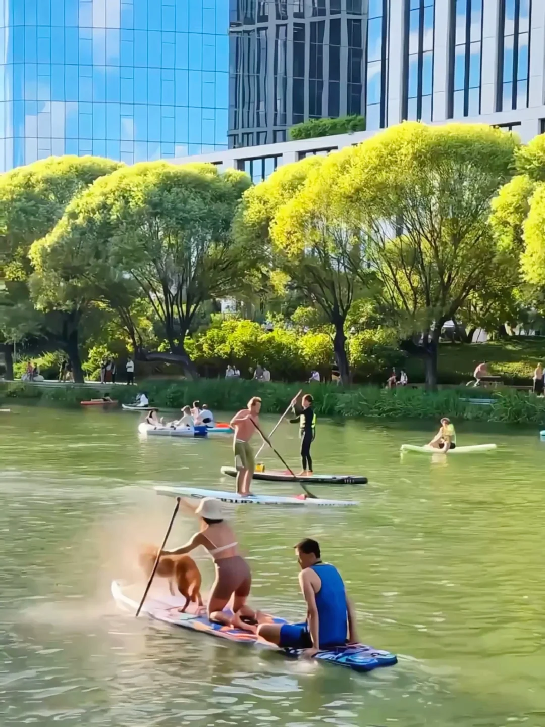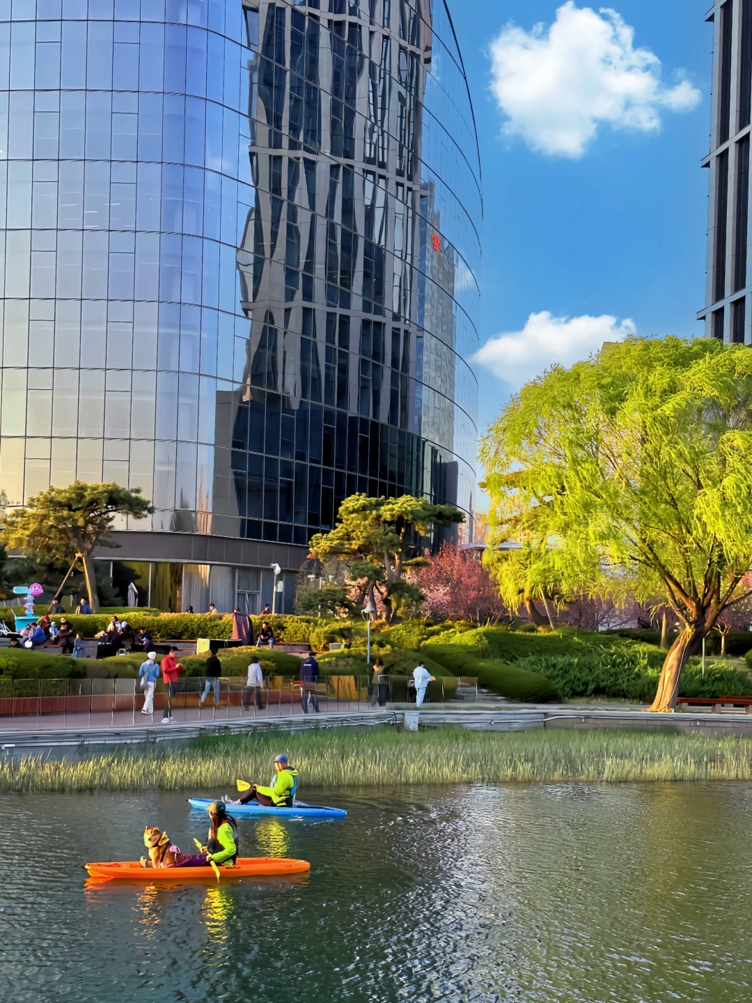 这一路绿树成荫,河中间有划桨板的,皮划艇的、游泳,也有坐在河岸边露营🏕️晒太阳看看书📖,河岸东边还有很多露天咖啡厅,餐饮,傍晚河面金灿灿的🚣不愧咱大北京