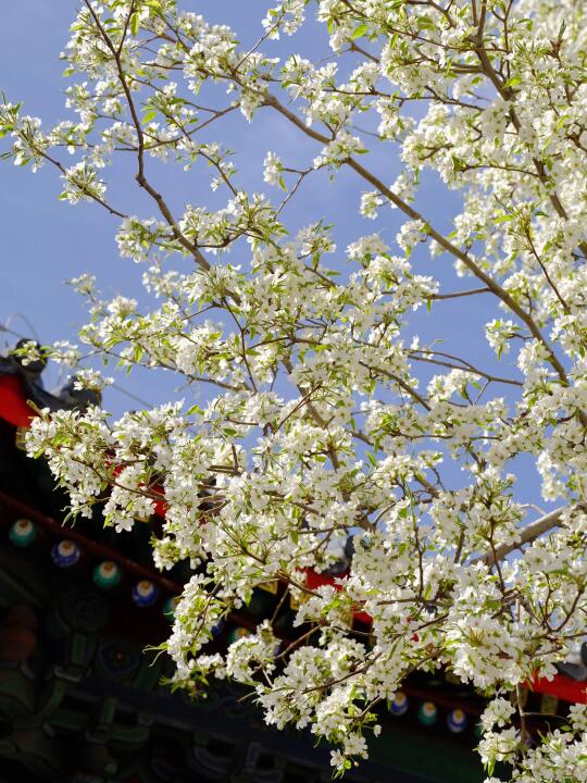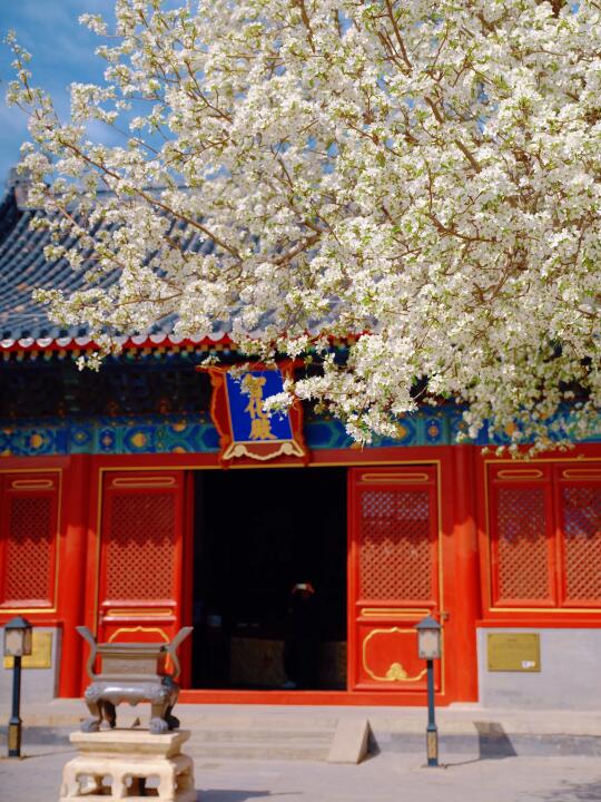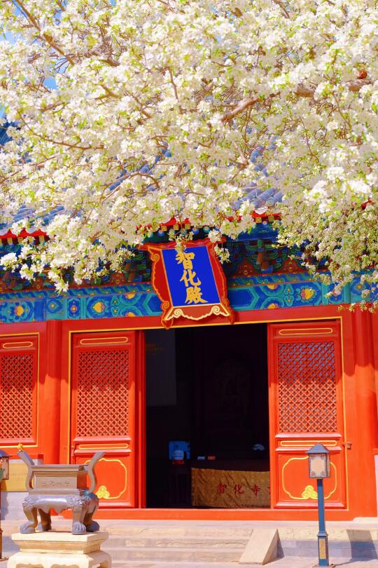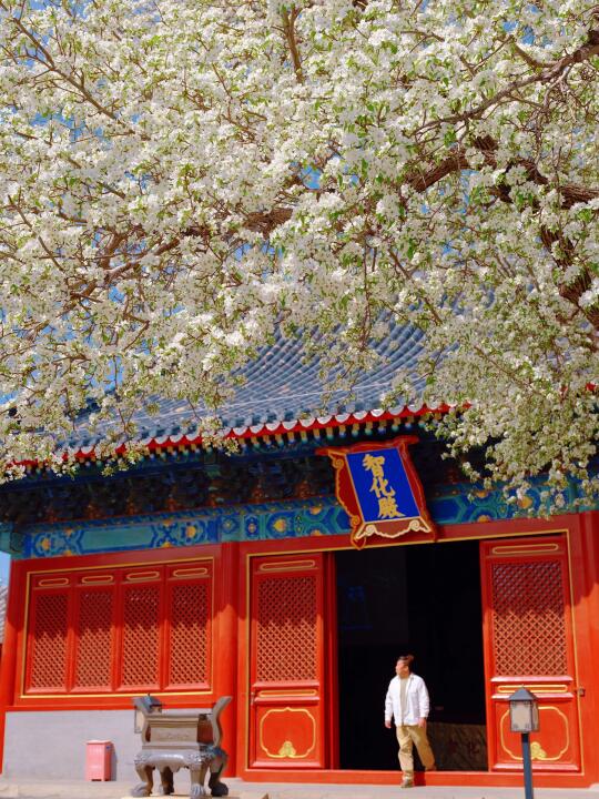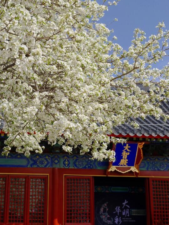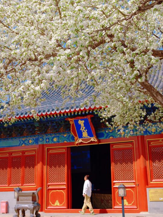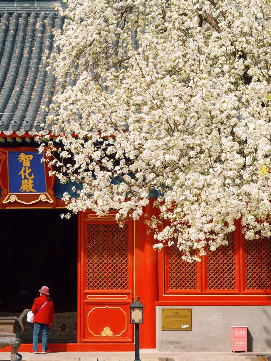 1⃣️智化殿前梨树左右两侧梨花树垂下特写,人物站大殿门前
