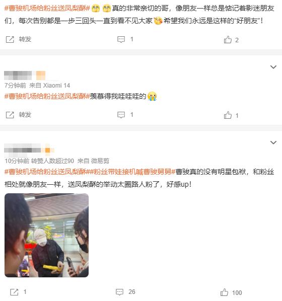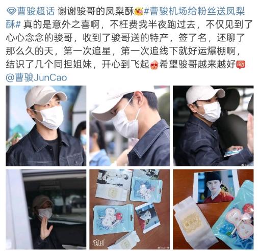 真没想到,从前“舅舅”叫个不停的曹骏,现在自己也成“舅舅”了。 曹骏今天飞机落地,戴着帽子口罩的他也是迎来了一波粉丝的欢呼。 其中一位粉丝带了自家孩子一起追星。 孩子喊了一声“舅舅”,曹骏也是立马回了一句鲜亮的“哎”。 因为粉丝们都喊曹骏“骏哥”,所以“舅舅”这个叫法也是没有一点问题。 除了和小粉丝互动之外,曹骏也是边走边给粉丝签名,看得出来没有一点架子。 等到签名完毕之后,他更是直接开始“饭撒”——发放凤梨酥。 这种和粉丝处成朋友的状态,看得追星人心暖暖的。 一直在努力的曹骏也是在今年迎来了大翻身。 先是在《无忧渡》里靠着文盲又帅气的哥哥形象出圈,打戏看着就很有力量。 马上他出演的电视剧《山河枕》也要播出了,这次他在剧中饰演的也是比较出彩的哥哥形象。 期待曹骏的新剧!