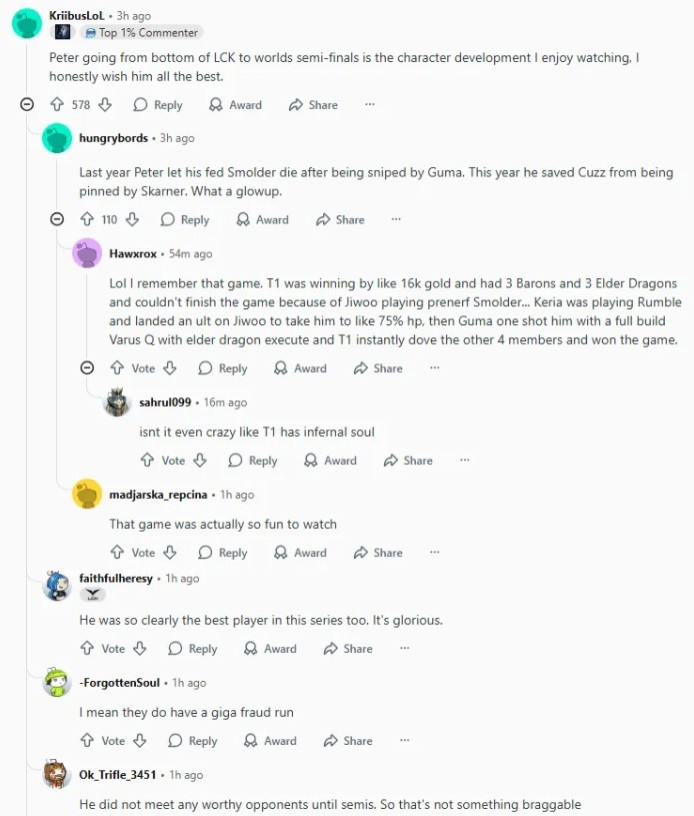 Peter从LCK垫底打到全球总决赛四强,这种角色成长正是我喜欢看的。衷心祝愿他一切顺利。