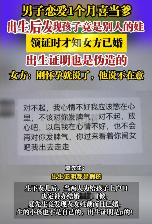 河南漯河,男子在女儿满月后本打算和女友领证结婚,同时给女儿上户口。可没想到系统一查,竟发现女友已经结婚了,而且女儿的出生证明也是伪造的,原来女儿不是自己的。想到自己如此宠爱女友,且给女儿办了20桌满月宴,男子气不打一处来,立即报了警,并要求女子还钱。万万没想到,女友却指责男子不受信用,明明一开始说过不在意的。(来源:深圳新闻网) 据悉,夏先生和女友戴某是通过网络聊天认识的,二人没接触多久,便确定了恋爱关系,之后更是同居在了一起。 一个月后,戴某检查发现自己怀孕了,这让夏先生十分激动。此后戴某就享受到了女王般的待遇,想要吃什么,想要买什么,夏先生都会一一照办,亲手送到戴某跟前,也从不让戴某做任何家务。 很快胎儿便足月了,夏先生陪着戴某到医院生产,最终戴某生下了一名女婴。好在夏先生家里没有重男轻女思想,大家对女娃十分的喜爱。在女儿满月后,夏先生大摆了20桌宴席来款待亲友。 然而在宴席结束后,夏先生的家庭发生了翻天覆地的变化。由于夏先生和戴某并未领证就生了女儿,所以二人便打算先去民政局领证,然后把婚宴给举办了,而且还要给女儿上户口。 可是当夏先生拉着戴某去民政局领证时,系统中竟然显示戴某已经结婚了,这下夏先生彻底懵了。 夏先生询问戴某到底是怎么回事,戴某却支支吾吾说不出个所以然来。后来为了女儿,夏先生打算让戴某离婚后再领结婚证,可谁知在给女儿上户口时,他又发现女儿的出生证明是假的,而女儿的生父并非夏先生。 这下夏先生彻底坐不住了,他愤怒地指责戴某欺骗自己的感情,要求戴某赔偿自己的一切损失。然而戴某却表示夏先生不守信用,明明一开始明确表示不在意的,现在又来反悔了。 夏先生不知道自己什么时候说不在意的,他气愤地选择了报警,怀疑戴某就是个骗子。 目前,戴某明确承认了自己有错,也表示可以和夏先生签订协议还款。 那是不是只要戴某赔偿了夏先生的损失,这件事就这么过去了呢? 其实并没有那么简单。戴某从始至终欺骗夏先生,使其在错误的认知下,自愿为戴某和女儿花钱,该行为其实已经构成了诈骗。 《治安管理处罚法》第49条规定,诈骗公私财物的,处5~10日拘留,可以并处500元以下罚款;情节较重的,处10~15日拘留,可以并处1000元以下罚款。 当然这治安处罚的前提条件是,诈骗的金额没有达到刑事立案标准。 按照河南省诈骗罪的立案标准,诈骗金额在5000元以上的,属于诈骗数额较大的情形;诈骗金额在5万元以上的,属于数额巨大的情形;诈骗金额50万元以上的,属于数额特别巨大的情形。 目前来看,自从夏先生和戴某同居以来,一直都是夏先生在花钱,包括生孩子以及办满月宴,这就算没有5万元,也超过了5000元。 因此,戴某很有可能会因诈骗罪而受到刑事处罚。 其次,戴某伪造了女儿的出生证明,这个行为也是违法的。 出生医学证明是《中华人民共和国母婴保健法》规定的具在法律效力的重要医学证明文书。是由国家卫生与计划生育委员会(现已更名为国家卫生健康委员会)统一印制的证件。 由此可见,这出生医学证明也属于国家机关证件,具有法律效力。 根据《治安管理处罚法》第52条第1项规定,伪造、变造或者买卖国家机关、事业单位或者其他组织的公文、证件、证明文件、印章的,处10~15日拘留,可以并处1000元以下罚款;情节较轻的,处5~10日拘留,可以并处500元以下罚款。 因此,戴某无论如何都违反了治安管理处罚法的规定,且还是两项违法行为。 按照规定,违反两项治安违法行为的,应当分别予以认定,再合并进行处罚,最高的治安拘留期限为20日。 对于夏先生的遭遇,您有什么看法?欢迎留言交流。