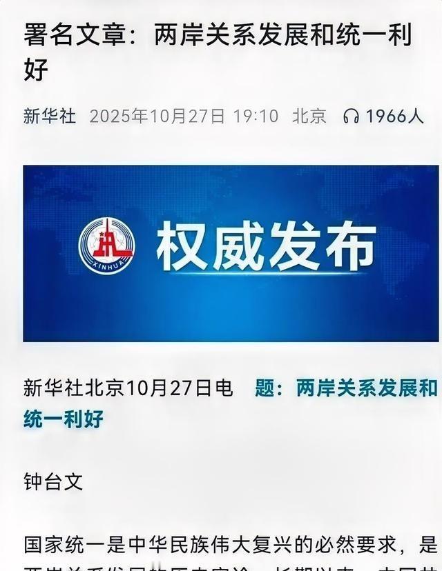 公开条件了!台办再次以钟台文署名公开发表第二篇文章《两岸关系发展和统一利好》,主要表达,统一后,台胞可得到5大利好: 1.充分尊重台胞的生活方式,保障合法权益。 2.帮助台湾省突破经济发展瓶颈。 3.你们的财政收入,可全部用之于民,尽享国家整体资源。 4.可共享民族荣耀,共享大国尊严。 5.彻底远离战争风险,确保安居乐业。 国家统一作为中华民族伟大复兴的必然要求,已成为两岸关系发展的历史定论。长期以来,中国共产党和中国政府始终致力于推进祖国统一进程,维护两岸同胞的共同利益。这次署名文章的发布,正是对当前两岸形势的及时回应。它强调,统一不是简单的领土归属,而是两岸同胞心灵的契合与福祉的提升。文章指出,两岸同胞血脉相连,守望相助的民族认同无人能改。无论外部势力如何搅局,国家统一和民族复兴的大势不可逆转。这份公开表态,从私下沟通转向阳光对话,体现了大陆的从容自信,也回应了岛内民众对未来的关切。统一后,台湾同胞将获得实实在在的利好,这些利好不是空谈,而是基于两岸经济文化深度融合的现实基础。当前,大陆已是台湾最大贸易伙伴,台胞在大陆投资就业的便利政策不断完善,这些已然成为统一利好的预演。 统一后的第一大利好,便是充分尊重台胞的生活方式,并保障其合法权益。这一点直击岛内一些人对统一的顾虑。长期分裂状态下,台湾社会形成了独特的生活习惯和文化表达,大陆明确表示,不会强求改变,而是通过法律和政策,确保台胞在大陆的各项权益不受侵害。譬如,台胞可享有与大陆居民同等的就业、教育、医疗和社会保障待遇。近年来,大陆已推出多项惠台措施,如台湾居民居住证的发放,让台胞能方便办理银行开户、购房落户等事务。这些举措已惠及数十万台胞,证明尊重不是口号,而是行动。统一后,这种保障将进一步深化,台胞无需担心身份转换带来的不便,而是能无缝融入更大平台的日常生活。这样的安排,不仅维护了个人尊严,也促进了文化多样性的和谐共存。 第二个利好聚焦于帮助台湾突破经济发展瓶颈。台湾经济高度依赖出口和半导体产业,但近年来面临全球供应链重构和地缘风险的双重压力。单一市场依赖导致增长乏力,产业升级受阻已成为顽疾。大陆拥有14亿人口的广阔市场和完整的产业链条,统一后,台湾可直接对接这一资源,避免被外部势力当作棋子。当前,两岸贸易额已超3000亿美元,台湾农产品和电子产品源源不断进入大陆市场。统一将进一步放开壁垒,让台企深度参与大陆的新基建和高科技项目,如5G、人工智能和新能源领域。台湾的创新活力与大陆的制造能力互补,能共同打造全球竞争力强的产业集群。这不是简单的经济援助,而是双向赋能,帮助台湾摆脱“卡脖子”困境,实现可持续发展。 第三个利好强调,台湾的财政收入将全部用于民生,尽享国家整体资源。台湾当局每年军费开支高达数百亿美元,这些资金本可投入教育、医疗和养老,却被用于采购外部武器,造成民生资源错配。统一后,没有了外部威胁的军购压力,每一分钱都能转向改善民众福祉。大陆的财政体系庞大,统一将让台湾共享全国基础设施建设和公共服务体系。譬如,高铁网络、数字医疗和生态保护项目,能覆盖全岛,让台胞享受到更高质量的公共产品。当前,大陆已通过惠台政策,让台湾学生免试入学大陆高校,台胞子女也能享受同等资助。统一后,这种资源倾斜将更全面,台湾的养老基金可与大陆社保对接,缓解岛内老龄化压力。这样的转变,不是剥夺自治,而是优化分配,让财政真正为民所用。 第四个利好是共享民族荣耀与大国尊严。这份情感层面的承诺,分量尤为沉重。两岸同胞本是炎黄子孙,当大陆在奥运赛场奏响国歌、在航天领域登月探火、在国际舞台捍卫权益时,台湾同胞却因分裂而被边缘化。统一后,每位台胞都能挺直腰杆,自豪地说“我是中国人”。当前,大陆的民族复兴成就已惠及全球华人,台湾同胞在大陆工作时,已能感受到这份集体荣誉。譬如,台籍科学家参与大陆空间站项目,共同见证神舟飞天。统一将消除身份隔阂,让台胞平等参与国家大事,共享大国崛起带来的自信与自豪。这不是抽象概念,而是实实在在的心理慰藉。 第五个利好在于彻底远离战争风险,确保安居乐业。岛内分裂势力炒作“武统威胁”,却忽略了其自身挑衅行为才是风险源头。历史反复证明,任何分裂企图终将失败,两岸和平统一是唯一出路。统一后,台湾将置于强大祖国的庇护下,免受外部干涉和军事摩擦之苦。大陆始终坚持和平统一、一国两制方针,从未放弃对话大门。当前,两岸虽有偶发事件,但大陆的克制与理性已赢得国际认可。统一将终结潜在冲突,让台胞子女免于战火阴影,安心工作生活。譬如,大陆的国防现代化确保了海峡稳定,台湾渔民已能更安全作业。这样的保障,不是空洞承诺,而是基于国家实力的现实支撑。