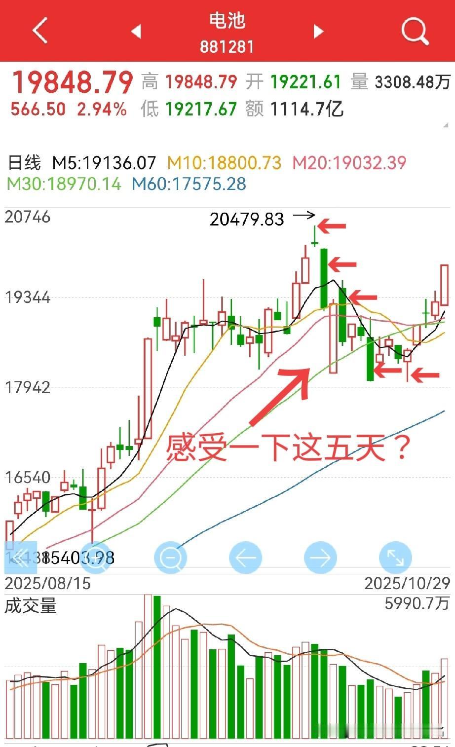 期待电池与券商板块新高! 大盘为什么这么强? 看看下图1圈内的走势… 本月中旬的震荡,特别是17日那根大阴线过后,说实话,连老股民这样的死多头都在当时短线看空,可以想象,有多少人会在中旬出局避险等3700点。 而24日与27日的阳线,让中旬出局的人追进来大部分人肯定心有不甘,然后今天就这样了。 今天,就有一点逼空的味道了。 再看看电池(下图2),图中箭头指着的五根K线,感受一下每一根K线的分时图,有多少人挺得住? 而券商板块,就更不用说了,连我也以为会用券商板块再杀一波大盘到3700点。 所以,大盘为什么这么强,为什么会逼空,电池、券商板块为什么会新高? 就是里面散户撤出多了! 股市中,情绪指标该怎么看,包括反.人.性,就是这么体现出来的!