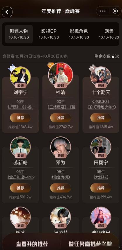 你五票我五票明天就看我想要 内娱这次搞大了,巅峰赛前三推荐值惊人,CP榜南北和无予伦毕双双破千万,我作为鸡排主理人,必须用上芝麻800认证拿额外5票,轻轻一点助力CP线下合体,目标C位,我们一起投票加油