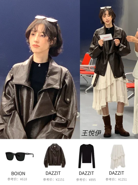 而王悦伊走的是甜酷路线,dzzit的宽松皮衣外套叠穿黑色修身内搭,搭配不规则白裙,层次感💯再加上复古棕色短靴,妥妥的文艺感女神,随时出片📸