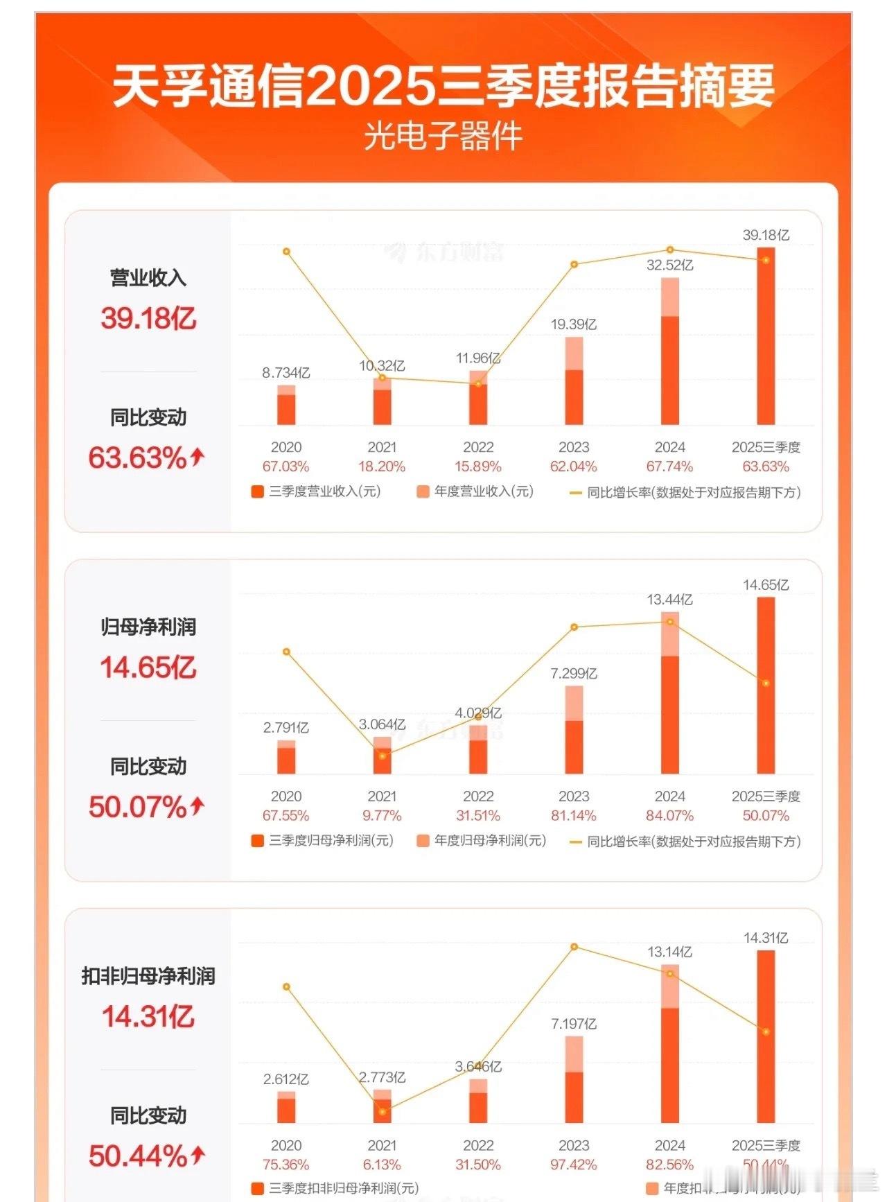 天孚通信2025年前三季度营业收入39.18亿元,同比增长63.63%;净利润14.65亿元,同比增长50.07%;每股收益1.8863元。