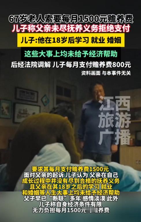 广东深圳,一67岁大爷因患病导致失去了劳动能力,他向儿子索要每月1500元的赡养费未果后,将儿子告上了法院。可儿子不仅不愿意给赡养费,还指责大爷没有尽到一个父亲的职责,更是在儿子18岁以后直至结婚,连一分钱都没支持过。法院调查发现,儿子已将父亲的联系方式拉黑,打算老死不相往来。(来源:江西旅游广播,深圳市中人民法院) 67岁的黄大爷在年轻时因劳累过度,导致晚年身体彻底不行了,患上了严重疾病。由于这个病导致无法干活,所以黄大爷的收入来源彻底断了。 黄大爷也不求能治好病,他只求能活多久是多久。可是没有收入来源,导致他已经揭不开锅了。 万般无奈之下,黄大爷去找了已经断联多年的儿子黄某,想要黄某每个月给他1500元的生活费,能解决温饱即可。 可是黄某不仅没有给黄大爷好脸色看,还果断拒绝了支付赡养费的请求,那冰冷的态度让黄大爷彻底寒心了。 后在他人的帮助下,黄大爷只能将黄某告上法院,要求其支付每月1500元的赡养费。 然而黄某在法庭上明确表示,自己是绝对不会赡养黄大爷的,因为黄大爷并不是一个合格的父亲。 法院经调查发现,黄某之所以这么说,是因为黄大爷在黄某还年幼时,经常外出打工,一出去就很久,让黄某成为了留守儿童。 黄某从那时候开始就恨起了黄大爷,认为别的孩子都有父母陪着做作业、参加活动,他却只能自己一个人。 黄某18岁后,面临升学和就业,这期间的费用都是黄某勤工俭学赚出来的,就连黄某结婚也是自己掏的钱。而黄大爷在黄某成年后,就没再给过一分钱。 之后黄某就把黄大爷的联系方式拉黑了,父子俩的感情越来越淡。 此外,黄某的经济条件也不怎么好,所以他无力负担黄大爷提出的1500元/月的赡养费。 对于这起案件,有网友表示,如果没你父亲赚钱养着,你能活到18岁?你都18岁成年了,难道还要啃老吗?这儿子简直不像话。 但也有网友表示,孩子小的时候做父母的如果不管,等老了却要孩子来养,这的确太不公平。 那法院会怎么判? 《民法典》第1067条规定,父母不履行抚养义务的,未成年子女或者不能独立生活的成年子女,有要求父母给付抚养费的权利。成年子女不履行赡养义务的,缺乏劳动能力或者生活困难的父母,有要求成年子女给付赡养费的权利。 由此可见,父母抚养未成年子女或者无法独立生活的成年子女,以及成年子女赡养父母,这都是法定的义务,而且是没有任何附加条件的。 比如,张三从小就没有得到父亲的抚养费,在父亲需要赡养时,张三还是有法定义务赡养父亲的。 具体到本案,法院调查发现,黄大爷并非没有抚养过黄某,在黄某年幼时,黄大爷就外出打工赚钱养家,只是黄大爷的确是很少能陪伴黄某。 但是没有陪伴只能说是黄大爷没有尽到一个父亲的职责,这与没有抚养过是两码事。 因此,黄某以黄大爷没有成为一个合格的父亲为由拒绝支付抚养费,这并没有法律依据。 其次,《关于适用婚姻家庭编的解释(一)》第53条规定,抚养费的给付期限,一般至子女18周岁为止。 也就是说,子女在18周岁以后,就不该再向父母索要抚养费了。当然,如果子女还在上学,无能力独立生活的除外。 法院调查发现,黄某在成年后已经能够独立生活。至于黄某结婚,如果按照传统来说,父母是应当给彩礼的,但这毕竟不是义务,而且黄大爷也没有能力给付彩礼。 综上,一审法院认为黄某有义务赡养黄大爷,不能找任何理由拒绝。 黄某不服,提起上诉,二审法院经审理后认为,一审法院认定事实清楚,适用法律法规正确。 不过,考虑到黄某的经济能力有限,如果处理过于生硬,会使得父子二人的关系更僵。 为此,二审法院对黄大爷和黄某进行了一番说理调解。 最终,黄某决定每月向黄大爷支付800元的赡养费。 当然,赡养义务并不只是包含支付赡养费。 《老年人权益保障法》第14条规定,赡养人应当履行对老年人经济上供养、生活上照料和精神上慰藉的义务,照顾老年人的特殊需要。 因此,黄某还应当多多探望黄大爷,给予他精神上的慰藉。 最后,父母抚养未成年子女和成年子女赡养父母,这并不是承上启下的关系,并不是父母必须尽到抚养义务,子女才需要尽赡养义务。但是作为父母,还是应当尽到父母的职责,否则即便将来通过诉讼让子女赡养,大家也会闹得不愉快。 您认为黄某是否应当赡养黄大爷?欢迎留言交流。