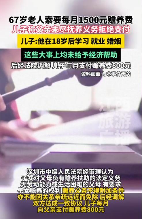 广东深圳,一67岁大爷因患病导致失去了劳动能力,他向儿子索要每月1500元的赡养